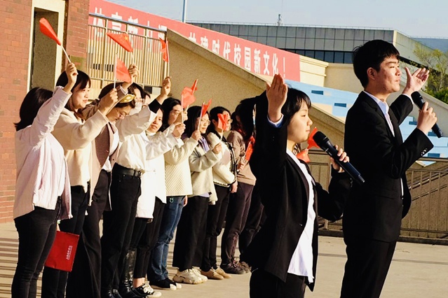 深怀对祖国无限的热爱和崇高的敬意,全体师生高声合唱《没有共产党就没有新中国》,歌声在校园上空久久回响……大家的歌声嘹亮、富有激情,他们挥舞着手中的红旗,激情昂扬的歌声中,爱国之情在每个人胸中升腾。