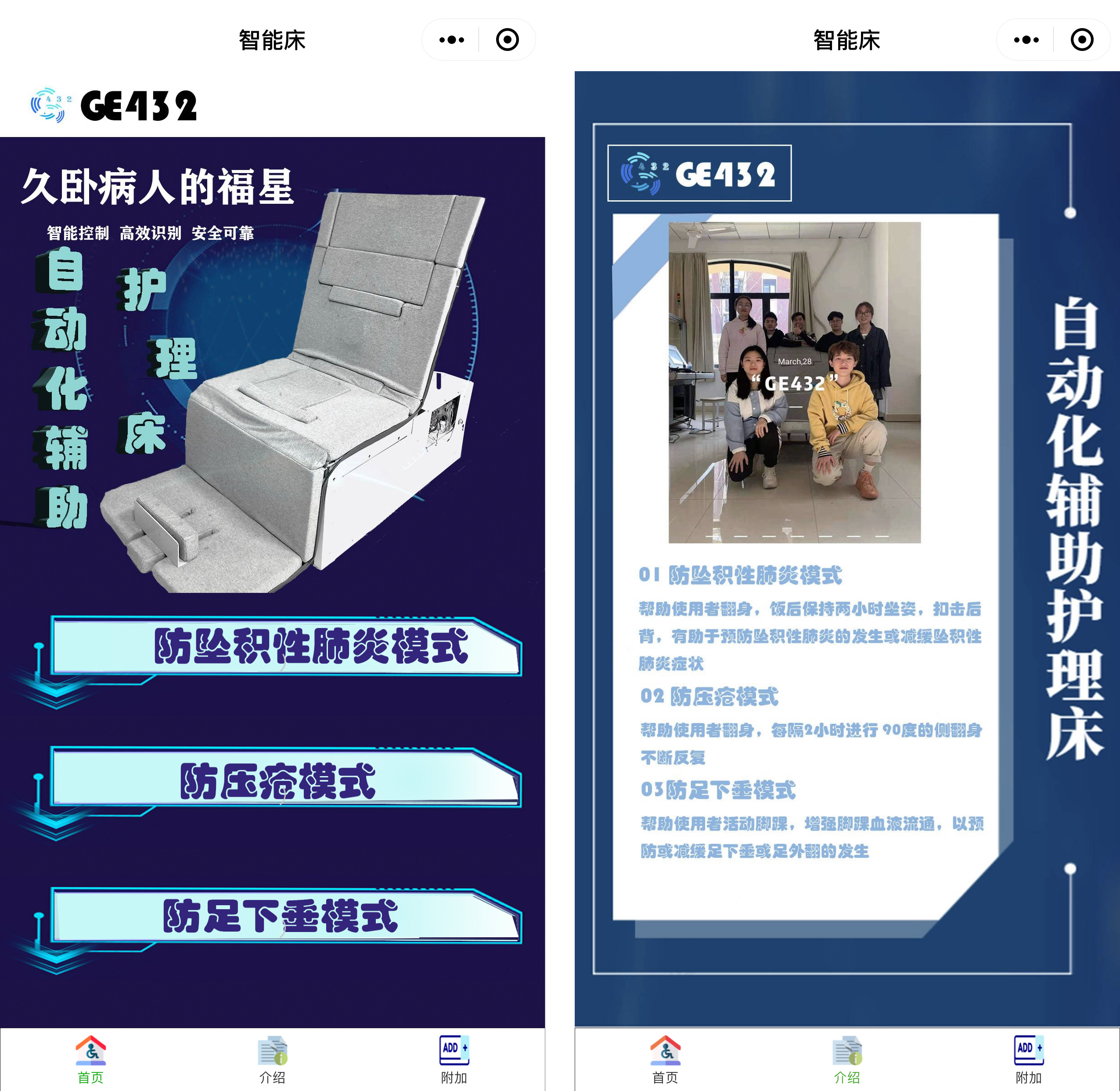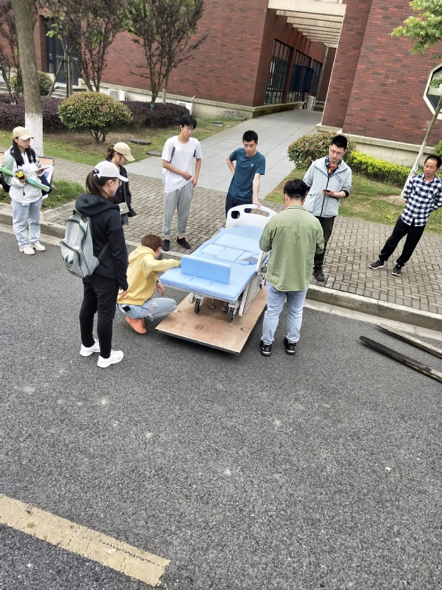 该科创项目由我校机电学院董嘉伟老师,创新创业学院刘立华老师与沈通老师共同指导,由邓恩黎、龙玉峰、葛鑫、詹敏敏、刘晓梅、吴俊杰、杨方润、刘章乐等8名同学共同研发设计。为了确保项目运用实效,项目组联合上海第六人民医院,共同完成前期调研。项目小组与第六人民医院压疮小组护士共同探讨设备合理性,并邀请她们来校实地考察设备制作进展,演示效果,并提出改近意见。除了实用性,为了提高使用便捷度,项目小组在选择控制程序上,使用微信小程序开发,通过蓝牙进行硬件控制,实现护理床实际状态与小程序模拟状态同步。甚至在小程序控制下,自主研发的连杆机构能够实现精细化控制,翻转角度可精确到1度。