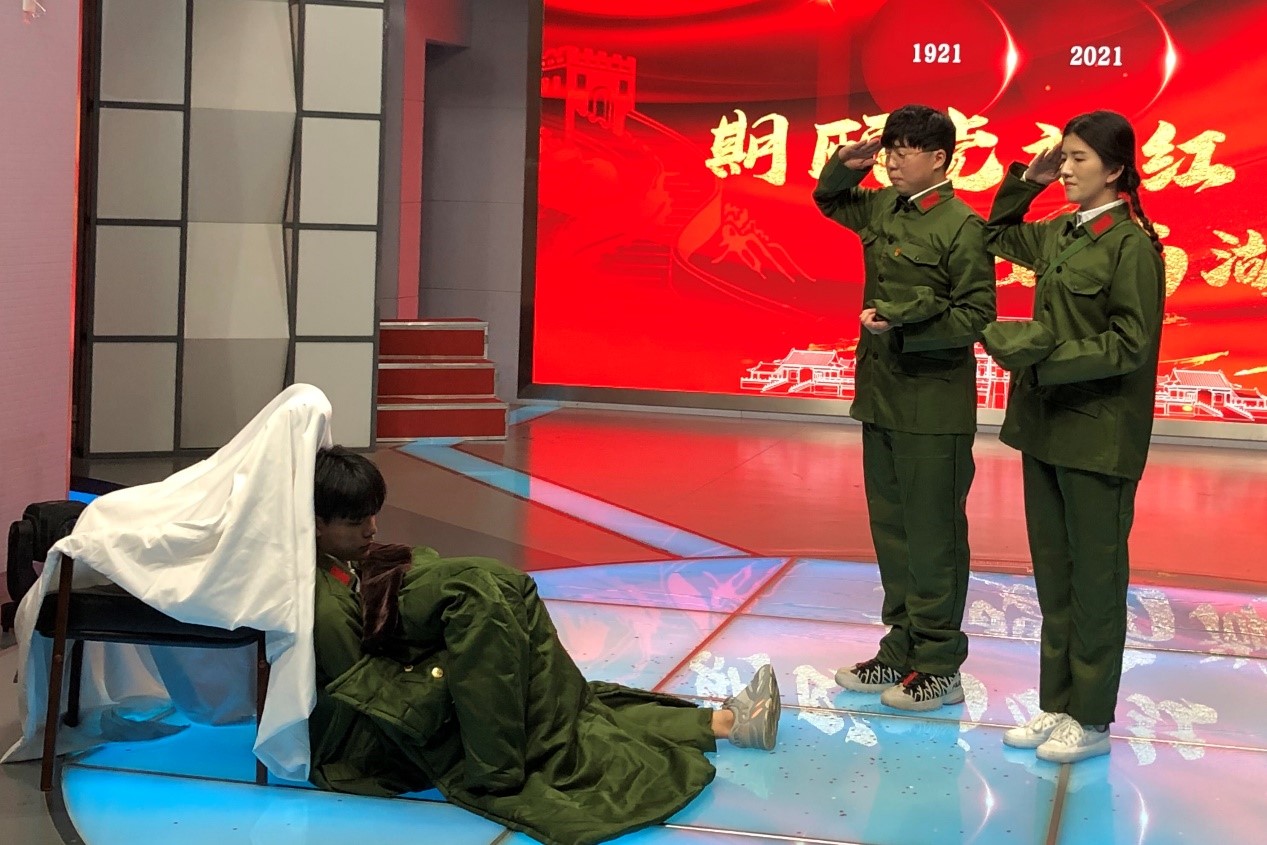 传播专业学生党支部带来了《我和我的祖国》,他们在其中融入了情景剧,通过长征途中的故事讲述了中国共产党一路走来的艰辛不易。