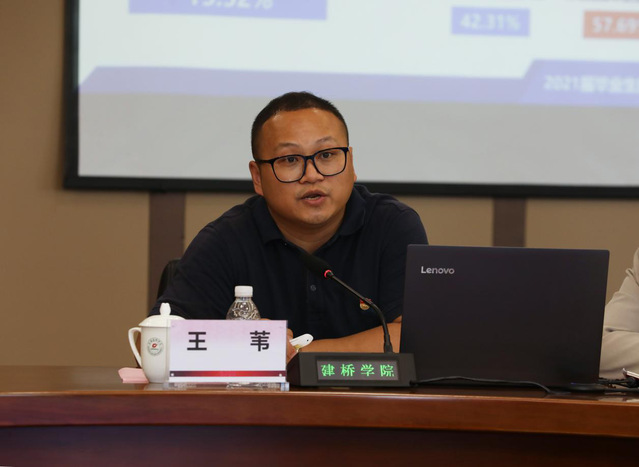 学生处副处长王苇汇报了2021届毕业生目前的就业情况、疫情常态化下我校多维度做好就业工作采取的相关举措、就业形势与分析,并对下阶段就业重点方向进行了安排部署。