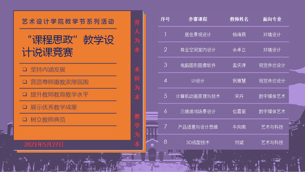 本次课程思政教学设计说课比赛为教师提供了一个相互学习、相互交流、共同提高的平台,为艺术设计学院“课程思政”建设工作积累了经验,开阔了思路,促进教学方法、理念的进一步创新。(供稿:艺术设计学院)