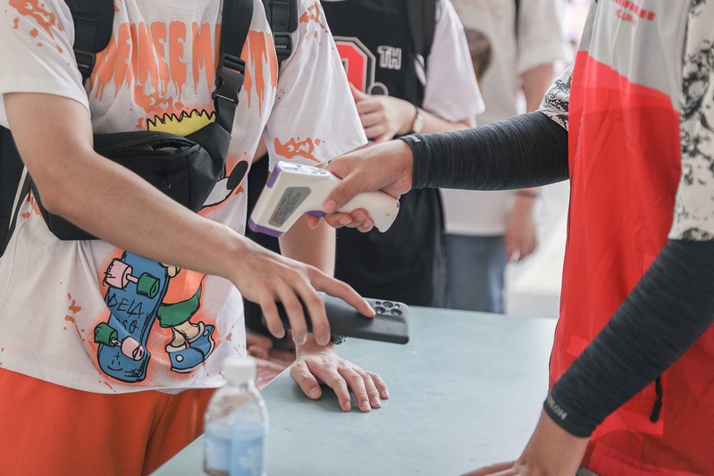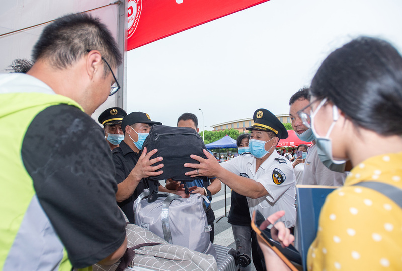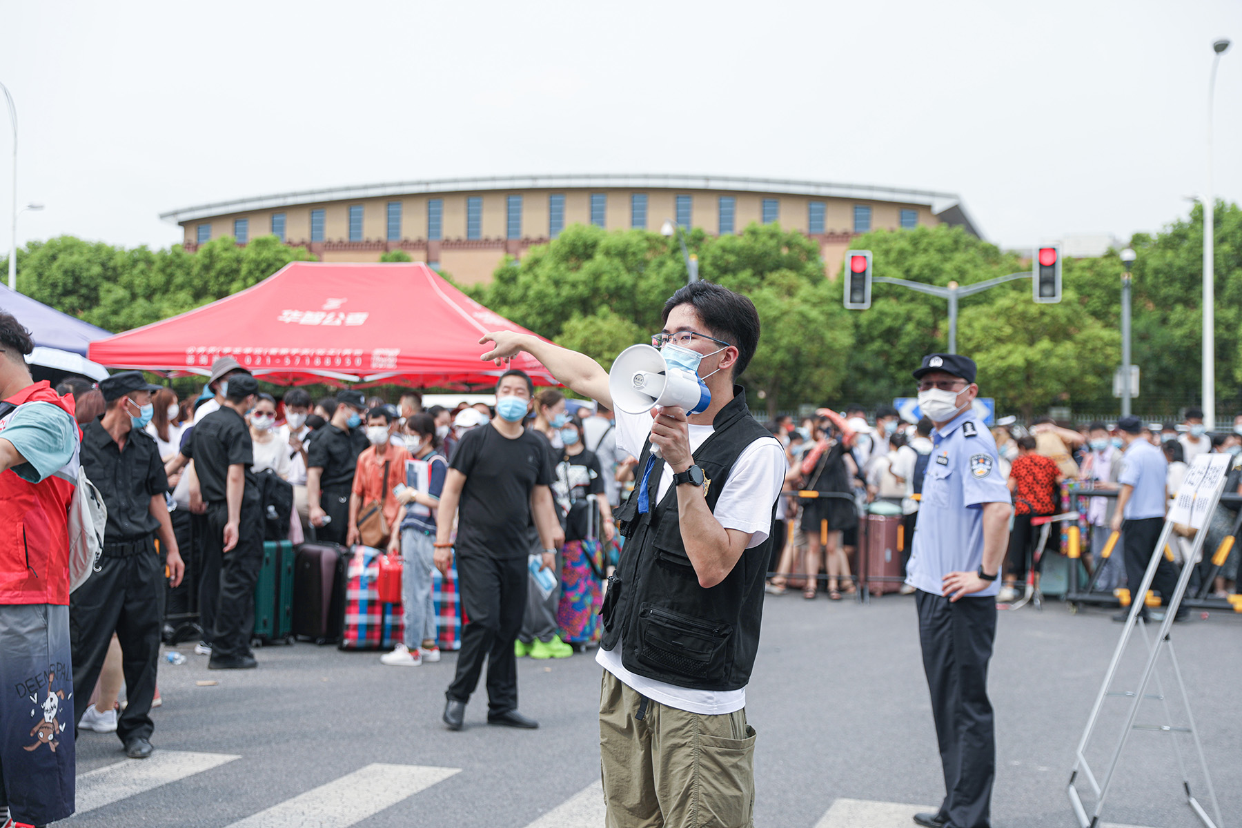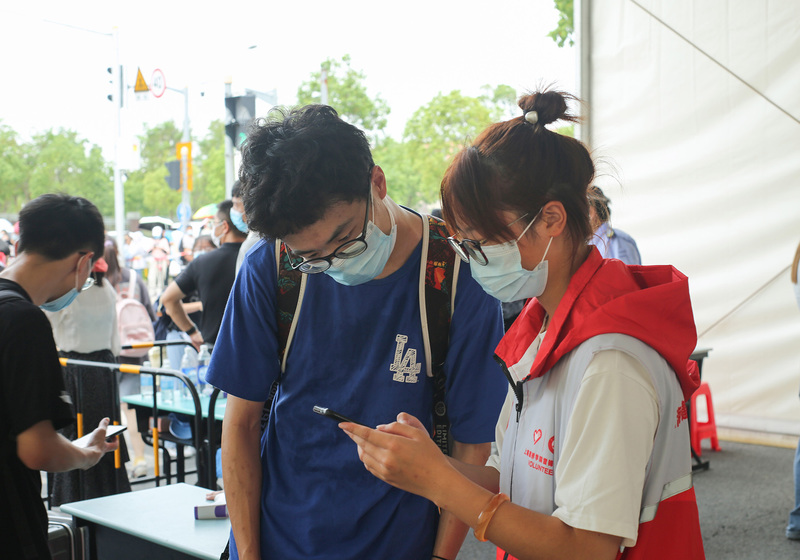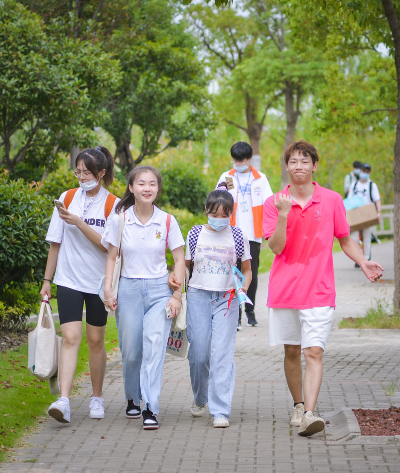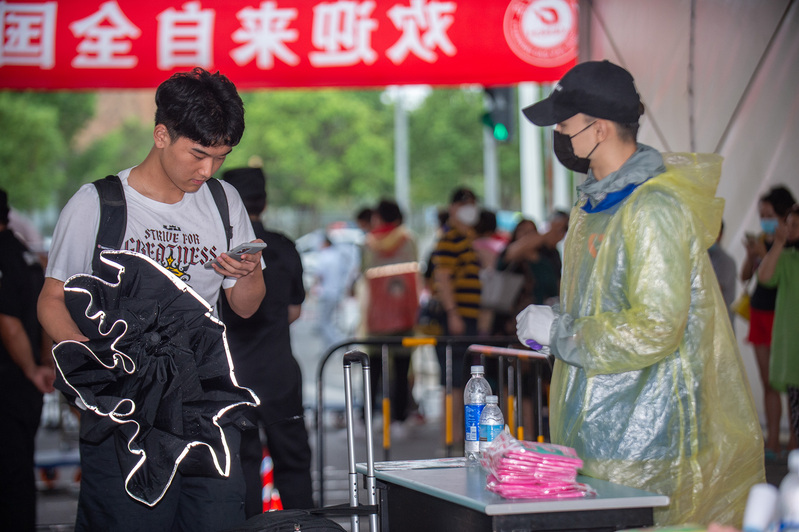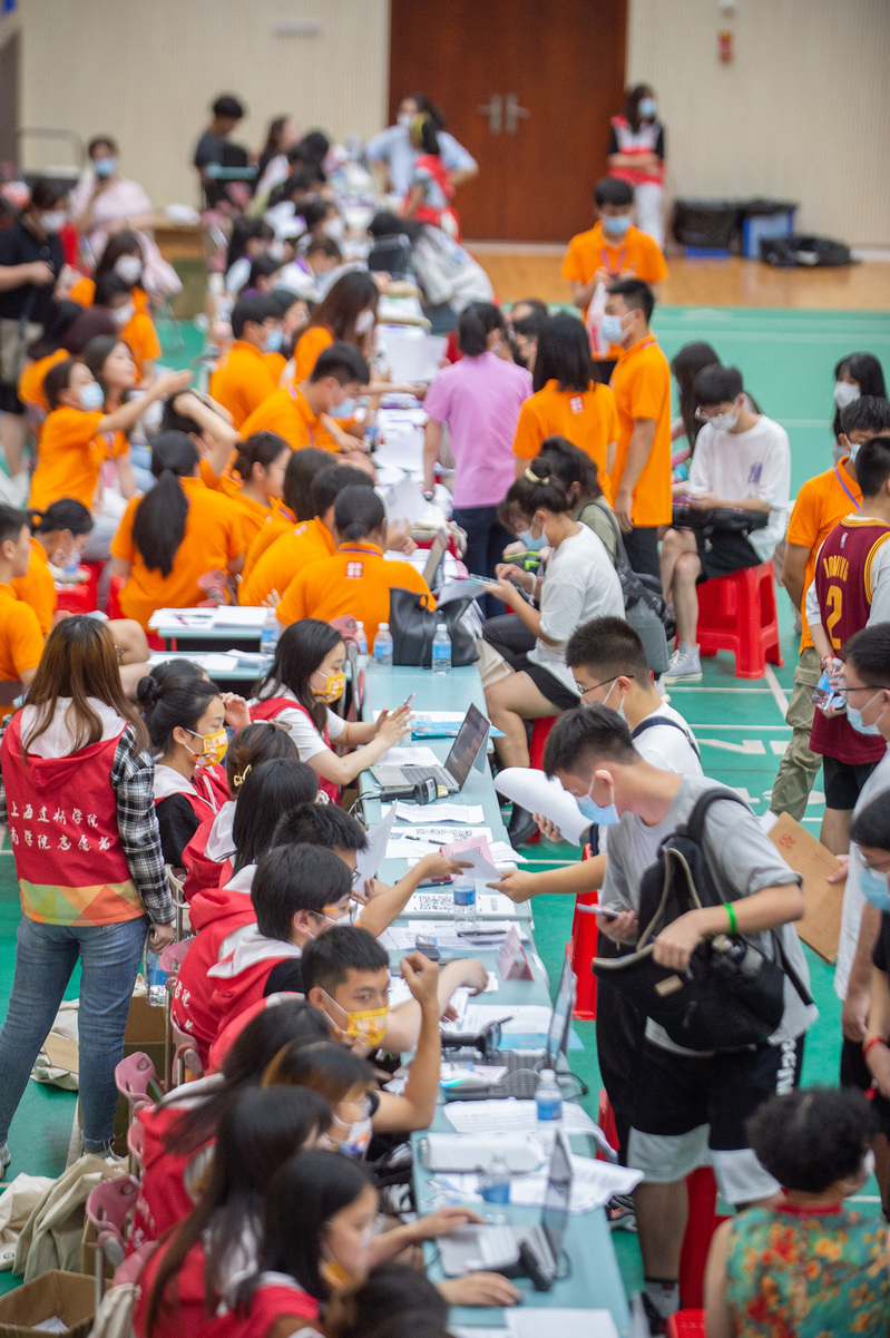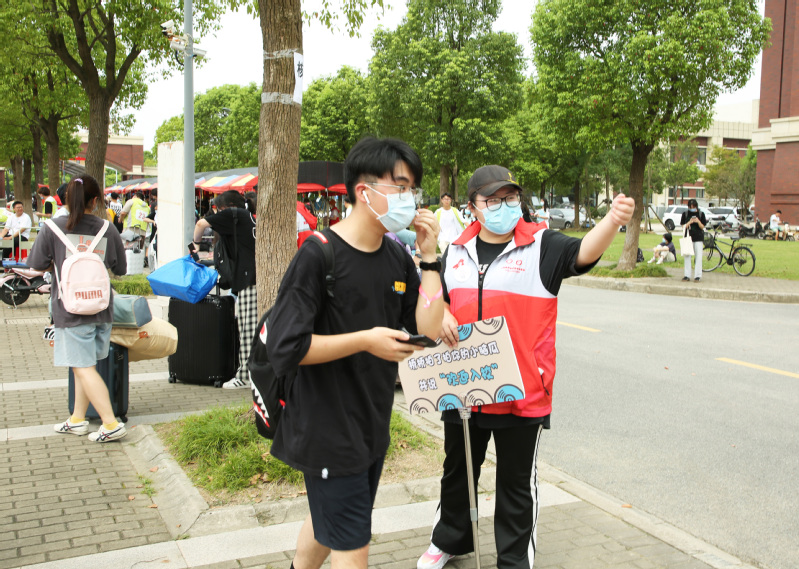 头顶着烈日,身穿黄色背心的志愿男生在门口耐心地将行李放置在小推车上,他一手提着包、一手拉着推车,将行李送至指定点。像他这样的志愿者,出现在测量体温处、核酸检测点、行李托运处……校团委、各二级学院近千名志愿者兢兢业业、恪尽职守,全力为新生营造一个爱的氛围。