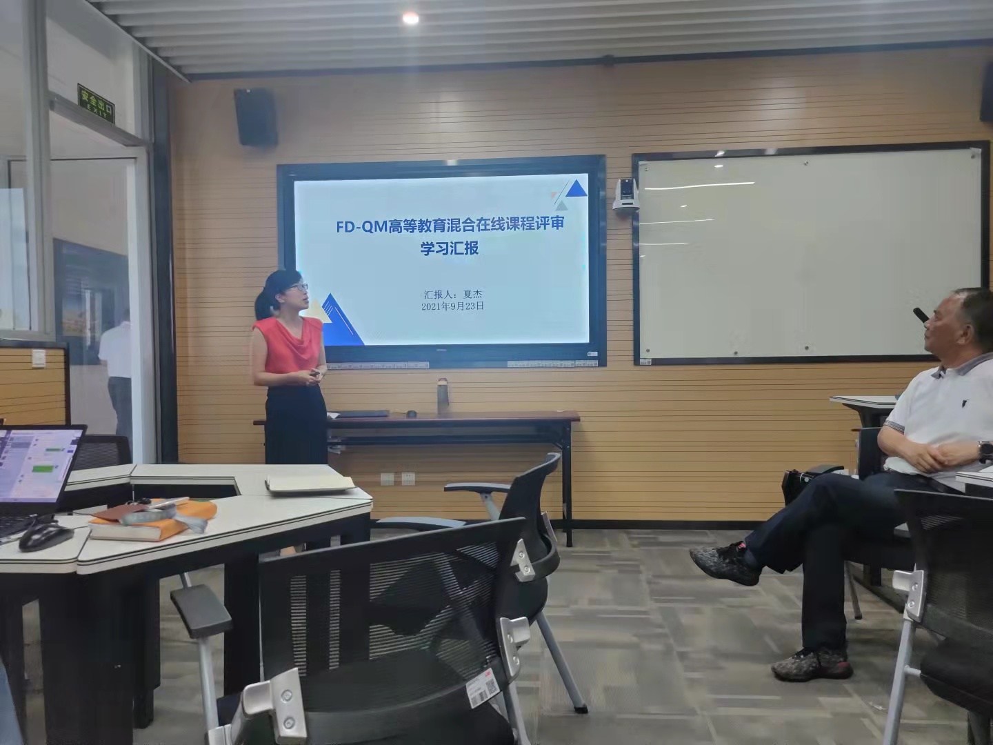 会上,夏杰老师汇报了于8月份参加的由复旦大学主办,各联盟单位承办的FD-QM高等教育混合在线课程质量标准评审会期间的学习成果及心得。