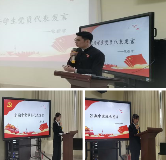 优秀党员代表宋新宇发言表示会坚定地拥护中国共产党的领导,听党话、跟党走,坚定信念;本期中党学员周之逸同学代表全体中党学员表决心,表示将牢记党的宗旨,端正入党动机,在党组织的领导下严格规范的自己言行,自觉接受党组织的培养与考察;本期中党班长余婷同学向中党学员们解读了本次培训的教学要求、规则制度以及考核内容,希望学员们在培训期间准时出勤、做好学习笔记、认真听讲、积极发言。