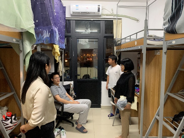 在当晚排查中,同学们晚间学习氛围浓厚,寝室卫生整洁,总体较好。在走访过程中周书记关心同学们在校园的生活和学习,提醒同学们一定要注意寝室卫生,不要使用违禁电器,国庆假日注意安全等,引导同学们过健康安全的校园生活,争创模范之家、文明寝室。同学们积极向学院书记、辅导员们汇报自己的学习生活情况,呈现积极向上的良好状态。