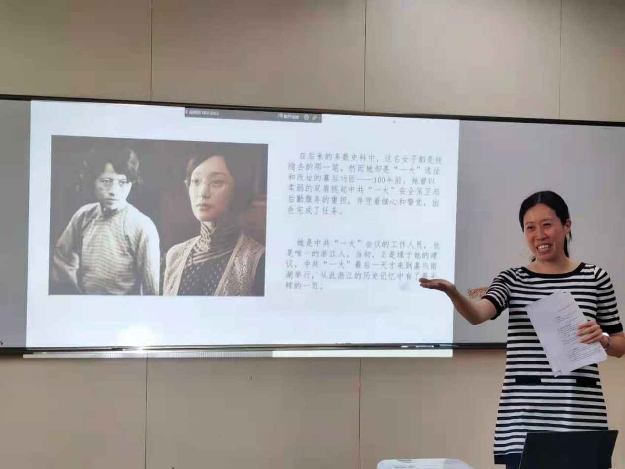 党史学习优秀代表章虹老师在会上分享了中共一大“卫士”——王会悟的先进事迹。王会悟以其智慧和勇气,掩护了一大的顺利召开和圆满结束,为中国共产党的诞生做出了特殊贡献。要向王会悟同志学习,做一个有理想信念、勇于担当的好老师。