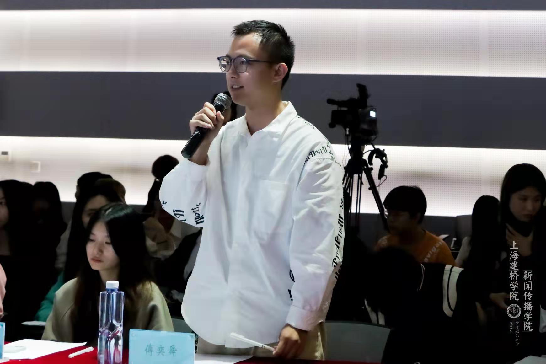 19级校主持人大赛冠军傅奕舜同学对第二轮选手们的临场应变能力表示肯定,并以诙谐幽默的方式指出部分选手阐述时长过短的问题,提出一个主持人在紧张高压的环境下也应展现出良好精神风貌的建议。