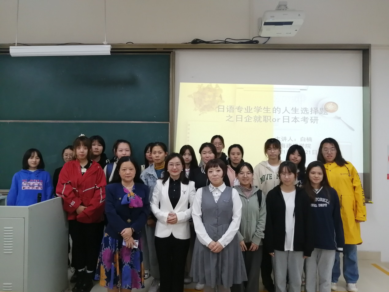 本次讲座的目的是为了丰富日语专业学生对自我的认知,提升其职业生涯规划能力。讲座中,作为资深HR的白楠老师,根据自身的工作经验介绍了日本企业的职场文化,讲授了合理运用日本企业的商业行为规范,从而达到完美的职场效应。在互动环节中,师生们根据未来的职业生涯以及日企文化等进行了深层探讨。