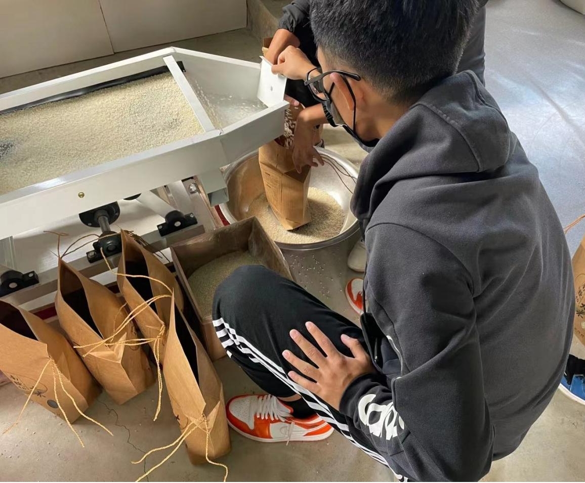 志愿者们在淼洋果蔬合作社进行水稻后期包装运输工作,第一步将事前收好的大米装进麻袋,再把麻袋中的大米倒入机器,由机器挑选颗颗饱满,圆润的大米粒,最后将机器挑选好的米粒倒入精美的包装袋子中,并且要保证每袋重量相同。