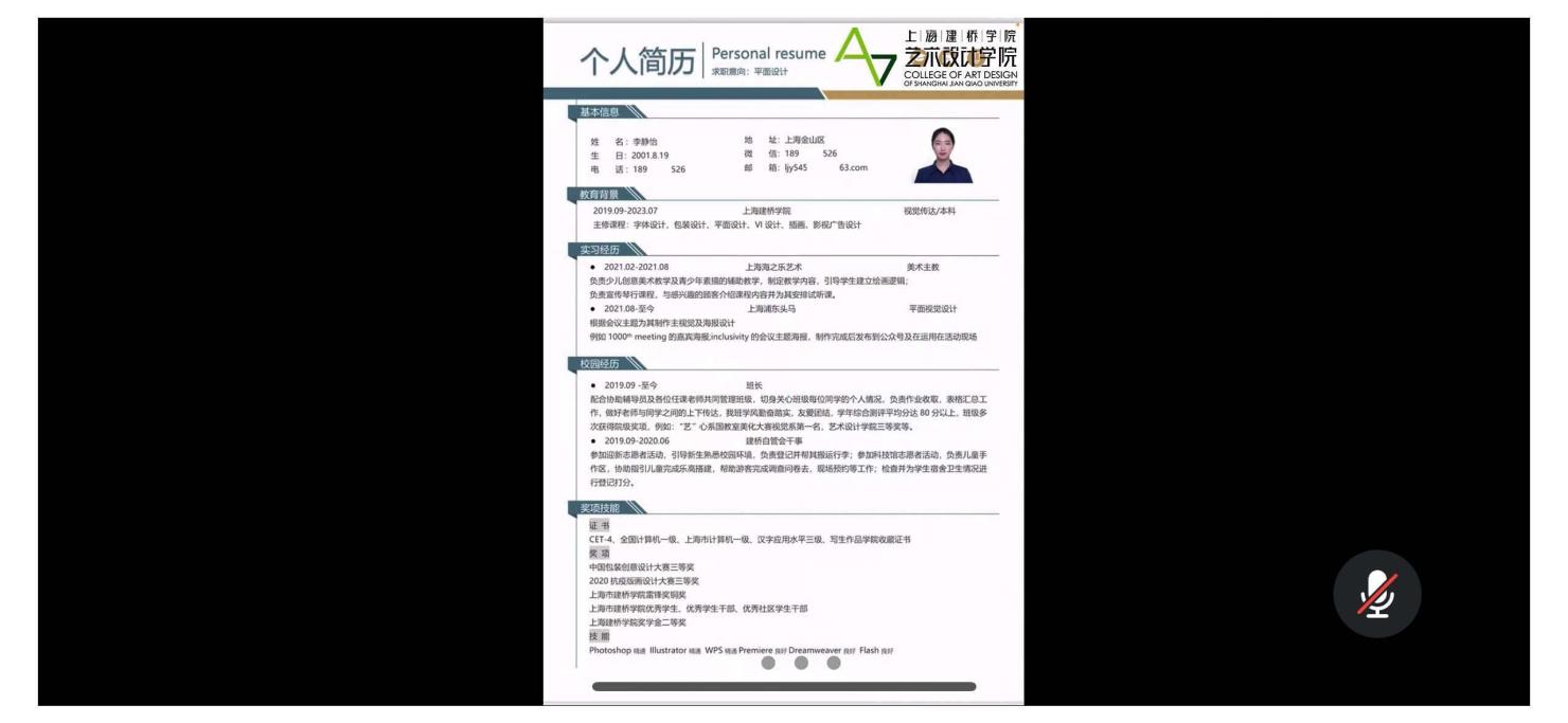 比赛中,各比赛选手呈现了精美的面试材料,满怀自信,侃侃而谈,发挥自身优势、展现个人能力,面对评委们犀利的提问毫无怯色,给评委和观众带来精彩绝伦的表现。最终,视觉传达专业李静怡同学凭借丰富的实习经验和优异成绩成为比赛中的“黑马”,获得评委老师们的一致好评。
