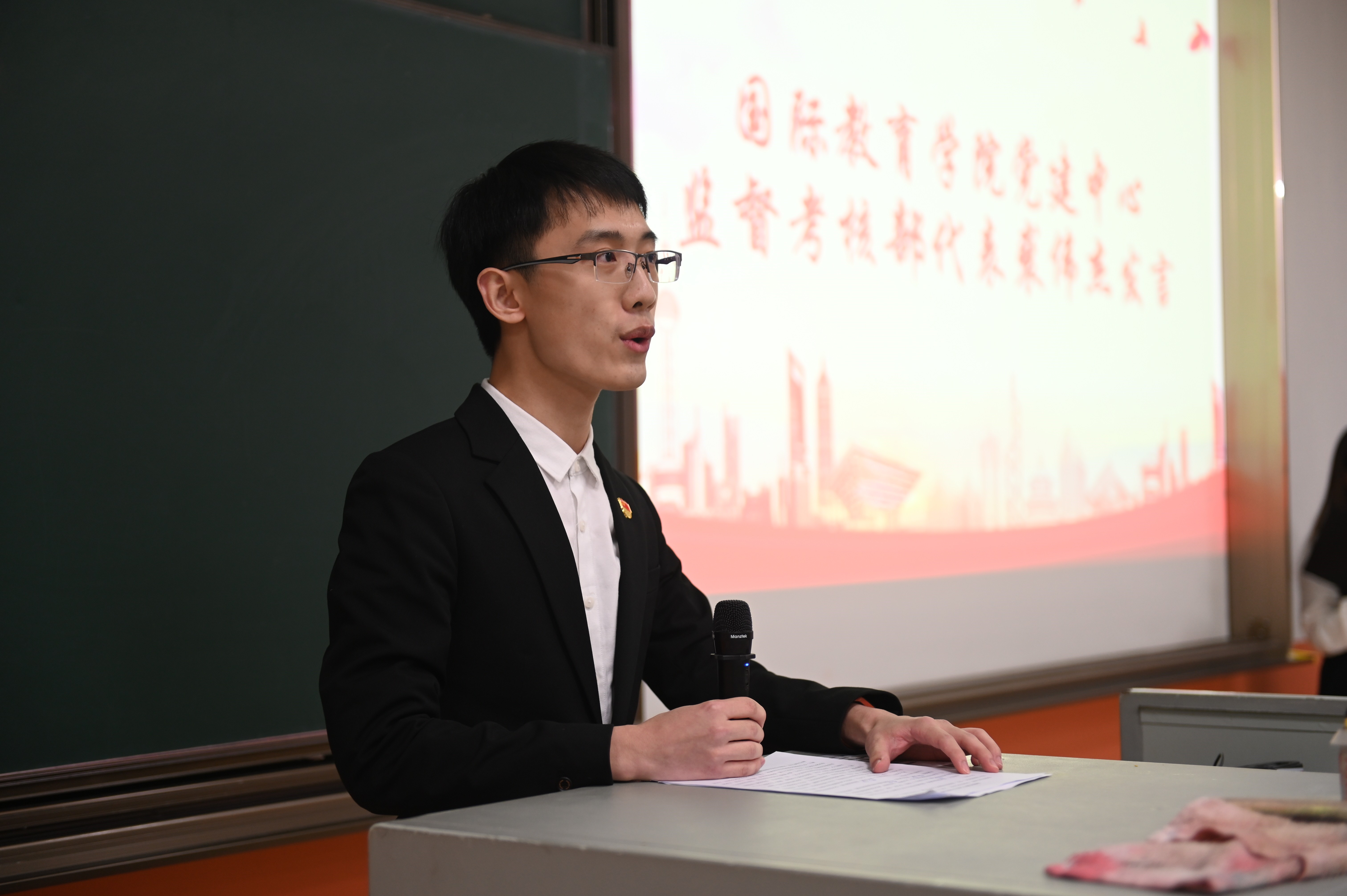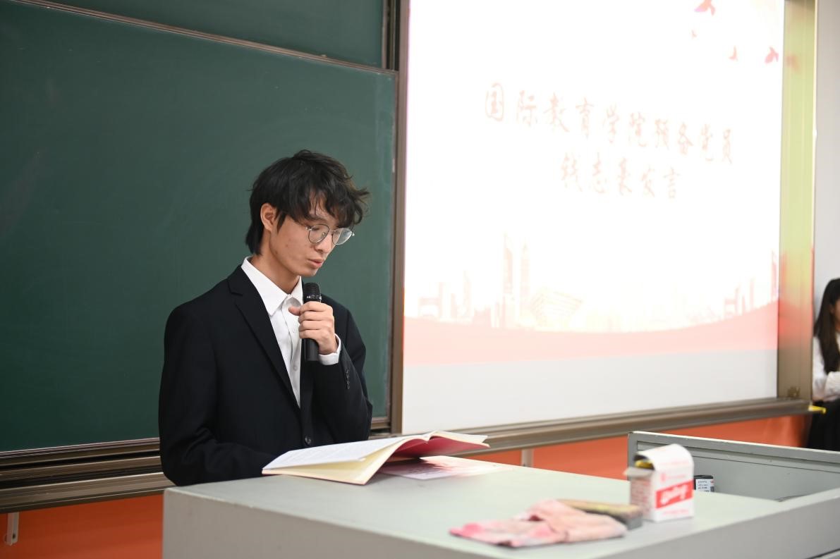 接着,国际教育学生预备党员钱志豪发言,他以自己的入党动机为出发点,讲述自己的思想发展过程以及实际行动,强调学习是永无止境的,鼓励同学们通过学习强国APP、党建网来不断武装思想,并提出作为党建中心的一员,时刻以高标准要求自己,起到先锋模范作用。