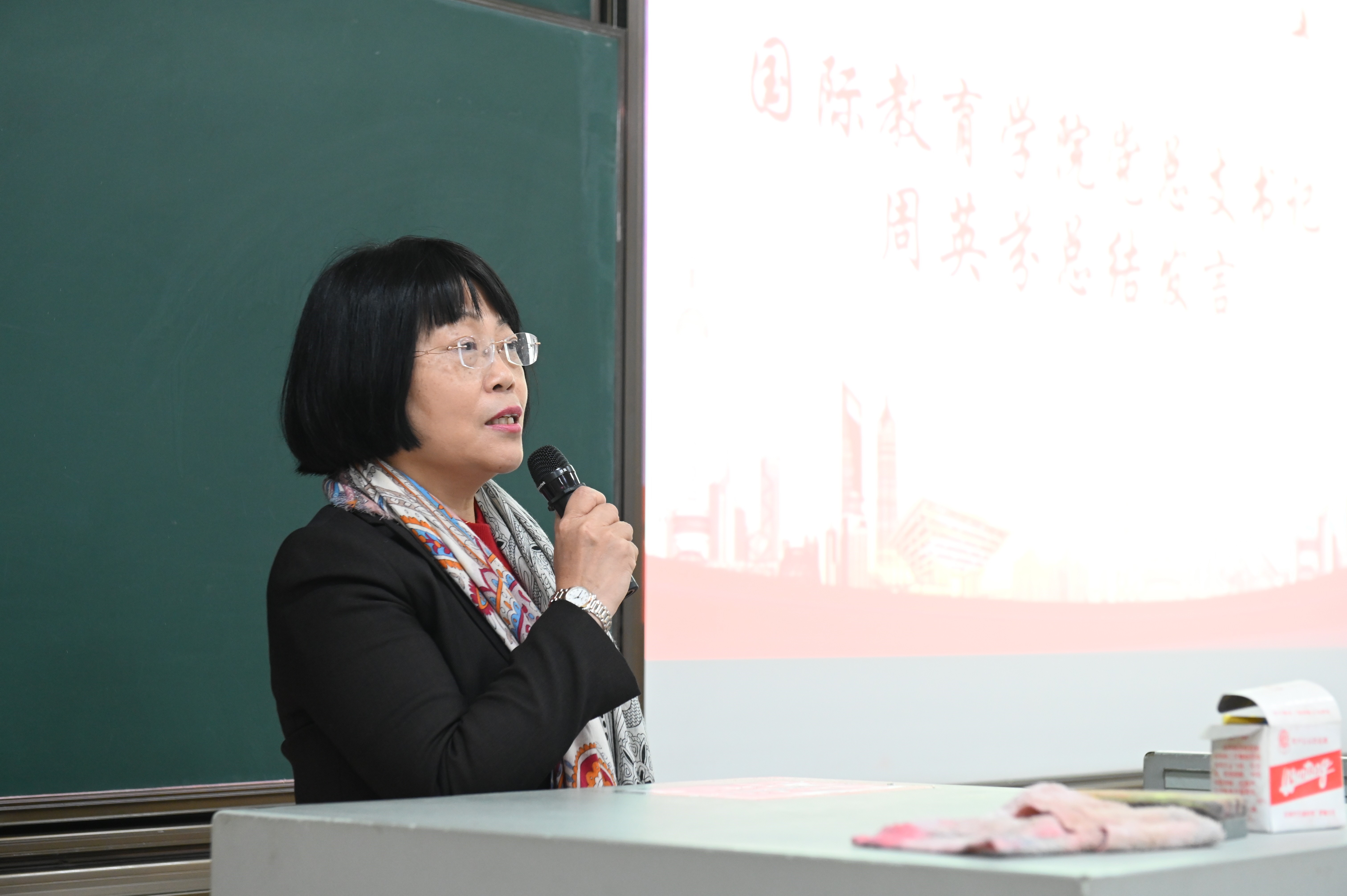 最后,国际教育党总支书记周英芬为大会作总结致辞。周英芬书记表示,首先,学院党总支将会引领党建中心加强理论学习和丰富实践活动;其次,肯定了党建中心成员的奉献精神,希望未来可以基于人才培养做出特色的党建活动;最后,以大会主题“开拓创新,勇毅前行”鼓励大家,希望同学们与学院发展同向同行,通过党建中心的平台得到成长,不负时代,不负韶华,锻炼为人民服务的本领,并带领身边同学一同进步,做合格的社会主义建设者和接班人。