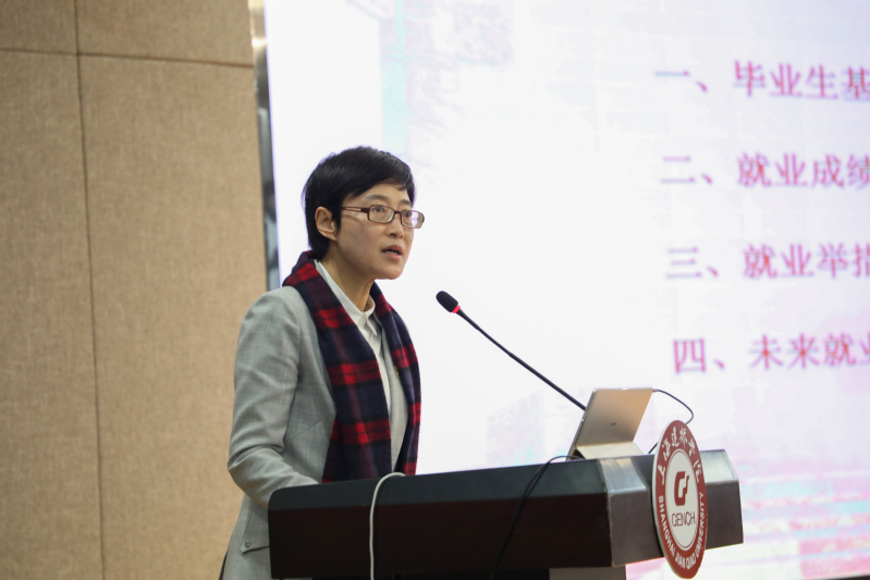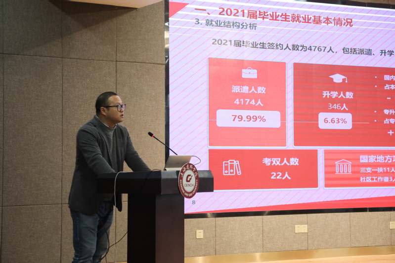 首先,学生处王苇副处长从2021届毕业生就业基本情况、就业工作经验和做法几个方面作2021届毕业生就业工作总结报告,并分析2022届就业形势,解读2021届就业奖励方案。