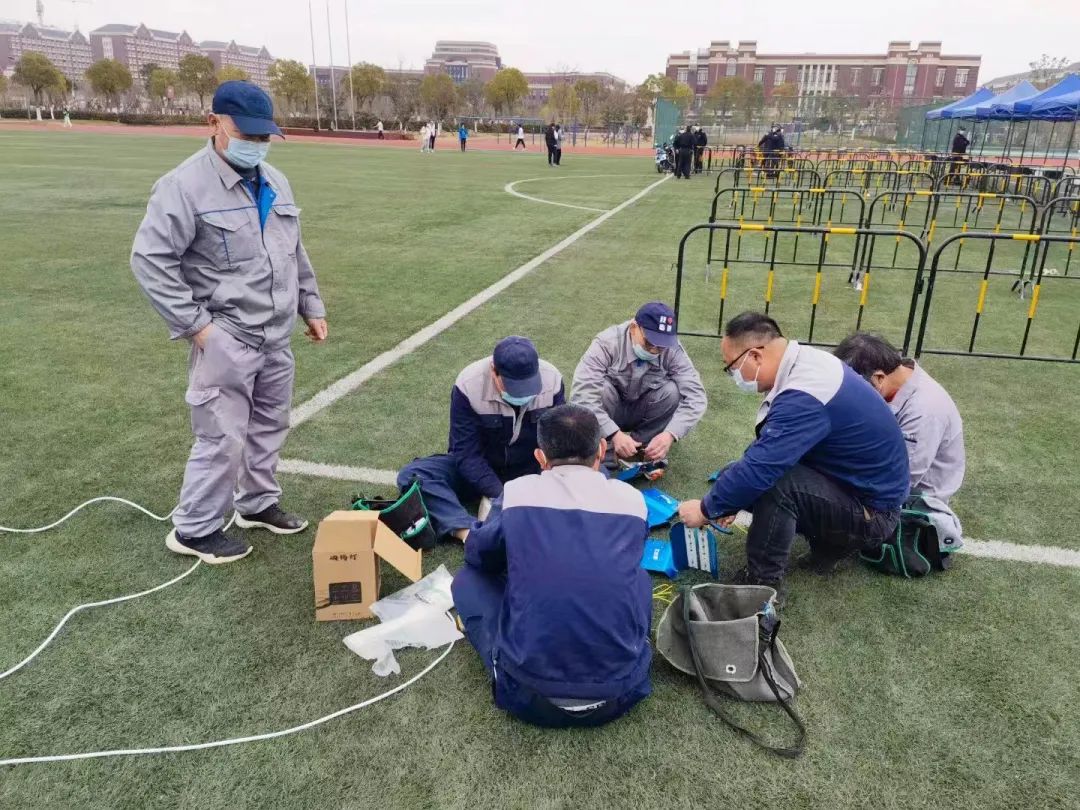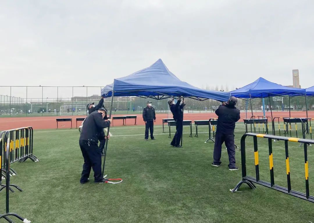 为确保核酸检测现场顺利进行,后勤保卫处迅速响应,工作人员搬运、搭棚、排线,在大操场安排了多个核酸服务点。