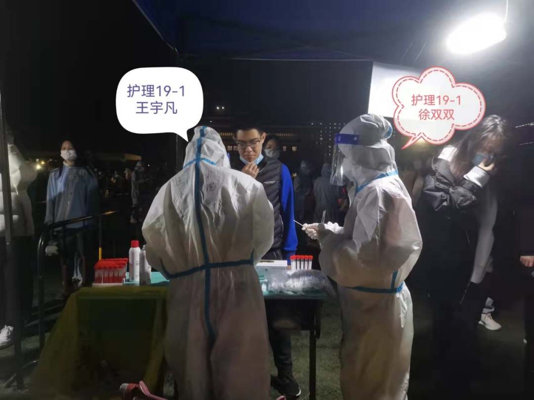 像王依婷一样,还有上海建桥学院健康管理学院王宇凡、徐双双等8名19级的学生主动请缨,发挥护理专业特长,不辞辛苦、已连续三天奋战一线,认真细致地为师生做好核酸检测服务。