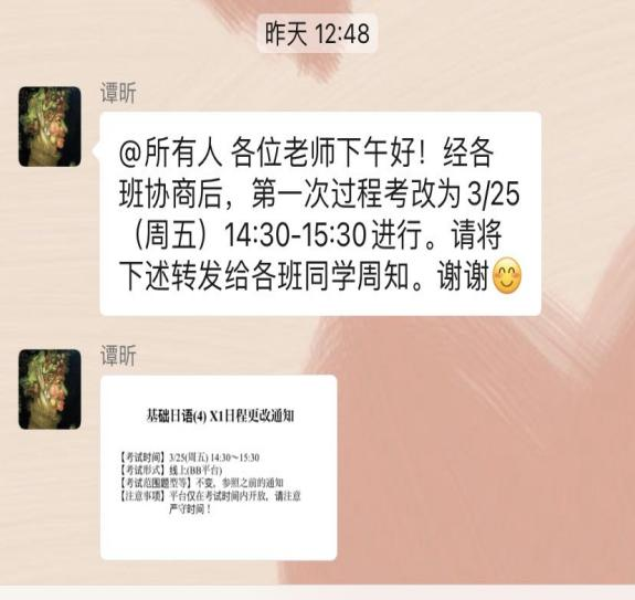 日语教学中心主任杨晓兴和骨干教师切合教师信息化办公实际决定中心所有课程均统一采用钉钉直播+BB平台建设的方式。以本科20级《基础日语(4)》为例,该课程团队7位教师在教学中心主任杨晓兴和课程负责人谭昕老师的带领下,通过集体备课、集体讨论、资源共享等保障措施,有序开展线上教学活动。