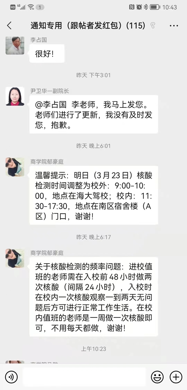 面对学院教职员工多、事务繁杂、办公室人手不足的情况,他主动承担起第一梯队在校值班开展办公室工作的各项任务,全面负责各条线工作。作为学院疫情防控的“中枢系统”,他坚持每日监督教职员工健康打卡,平均每周要转发各类文件、通知、公告10余次;通过微信、金山文档、电话等有效方式,发送防控指令50余条,准确报告给院领导、传递给教职工,预订和组织各类线上会议,并把工作情况及时反馈给学校办公室、后勤保卫处、人事处,持续做好学院132名专兼职教职工的提醒、要求、信息统计、排查、汇总上报工作。