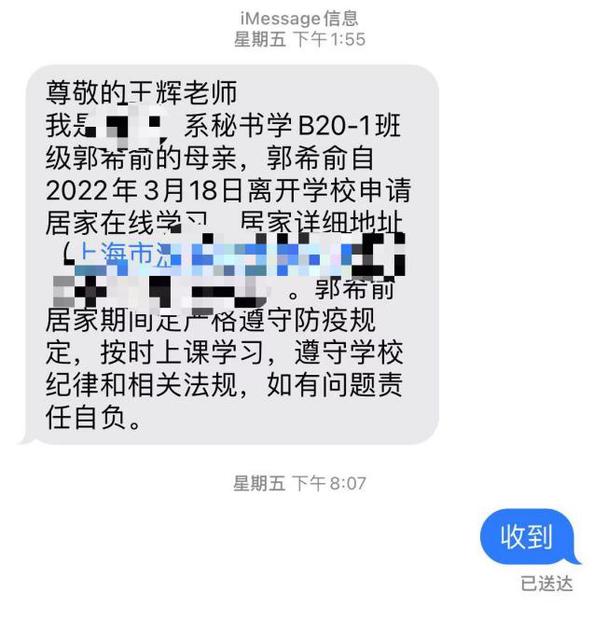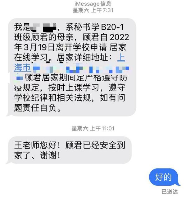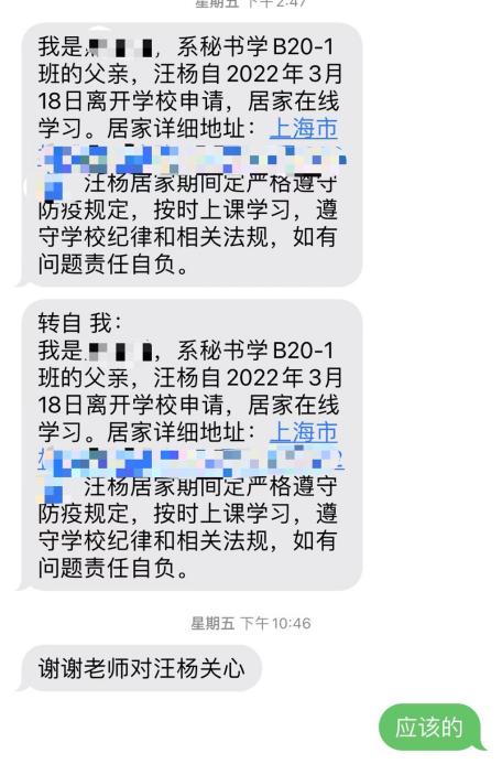 为确保在上海有固定住所的学生有序离校并正常参与正常学习,王辉老师与每一位学生“点对点”联系,确保每一位学生能够顺利、安全到家,健康、高效地参与线上学习。3天之内,王辉老师的68名学生顺利离校返回本市住所,并在各自社区、小区的防疫要求下生活与学习。