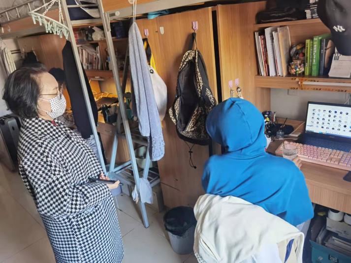 严峻的疫情态势下,“不能离校”、“无法正常上课”让部分学生倍感焦虑,甚有学生出现更严重的紧张情绪。作为学生心中的“定心丸”,她深入宿舍,耐心倾听学生诉求,帮助学生疏导紧张情绪,提醒学生按时休息,对学生进行学业指导。