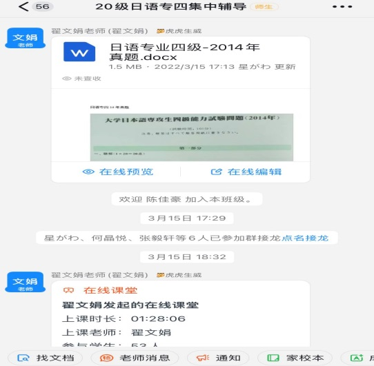为保障日语专业学生顺利通过日语专业四级考试,教师党支部党员教师齐上阵,主动利用课外时间,一周两次,平均每位教师负责5-6名学生的专四线上辅导答疑工作,一个也不落下,发挥辅导小组小而精的优势,根据考题特点,着重为学生讲解专四知识点和进行真题训练,还发布模拟考题、分享知识点提要。