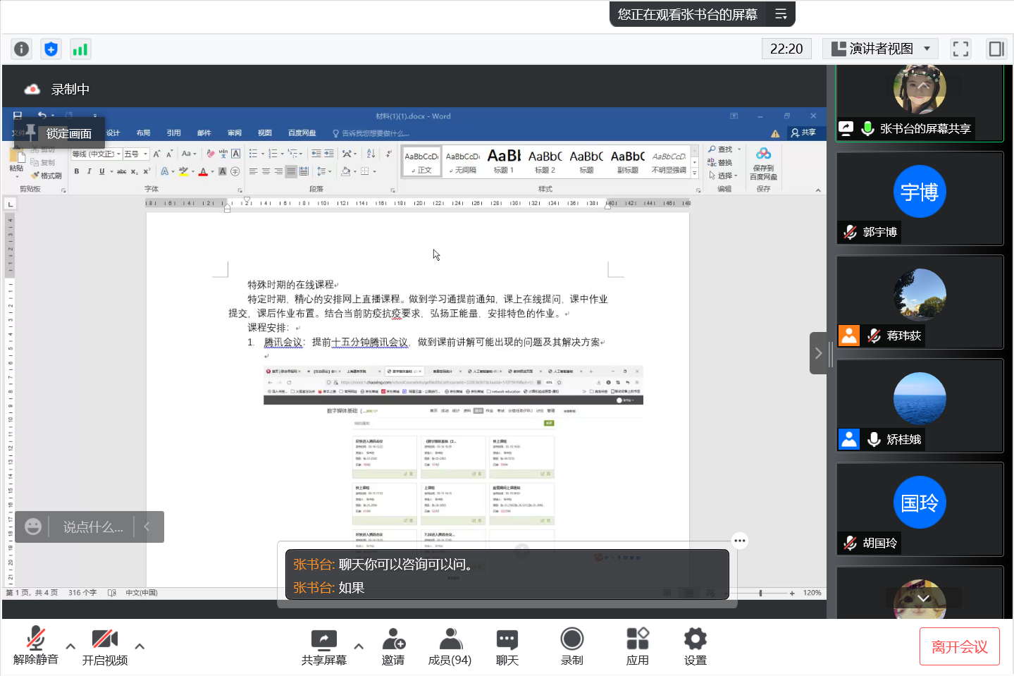 最后,张文俊院长作大会总结。他积极肯定每位老师在面对疫情、面临困难时刻不松懈的精神,感谢每位老师为学生全心全意的服务。他强调,各位老师要做好自身防疫,保证个人身心健康;继续保障学院线上教学的有序进行;同时关注学生就业实习,推动学院各项工作顺利开展。(供稿:信息技术学院)