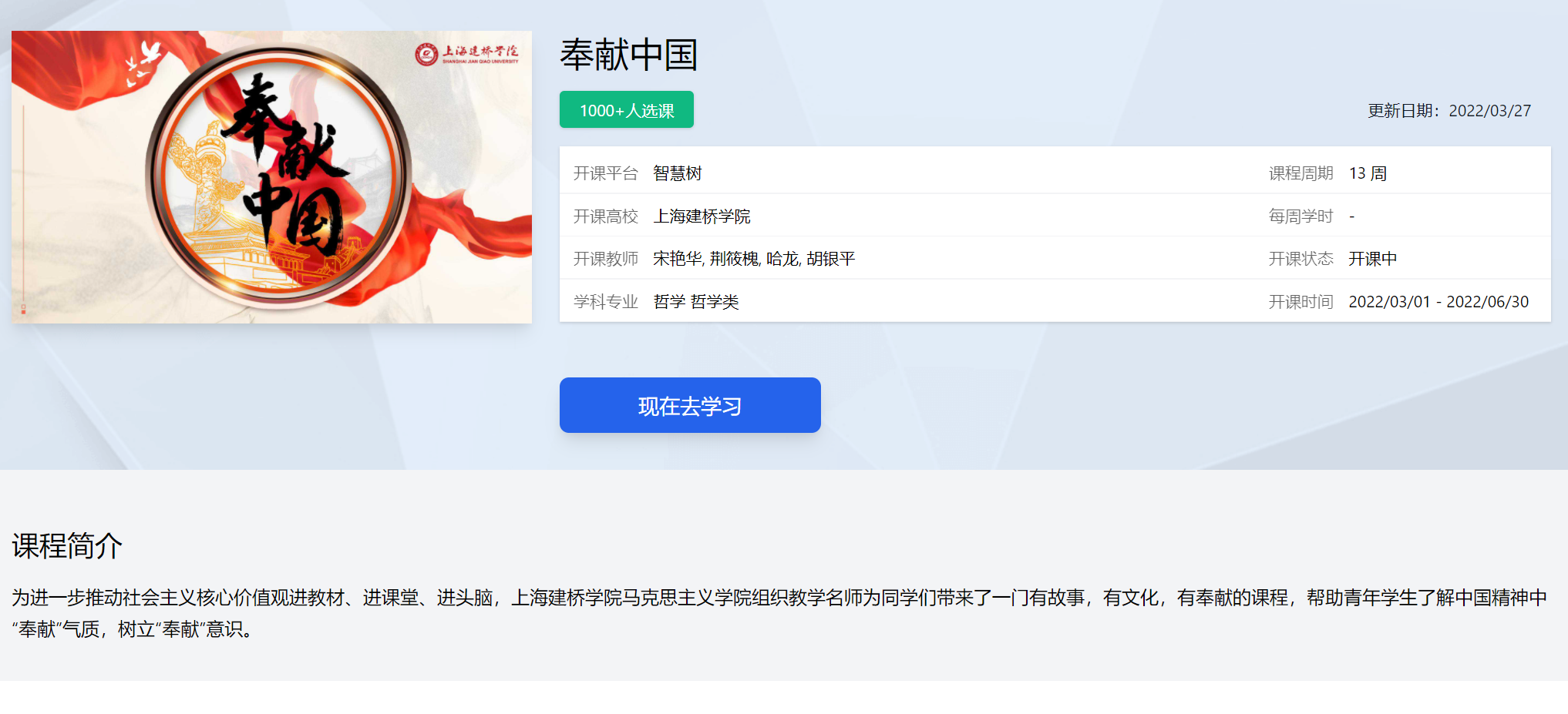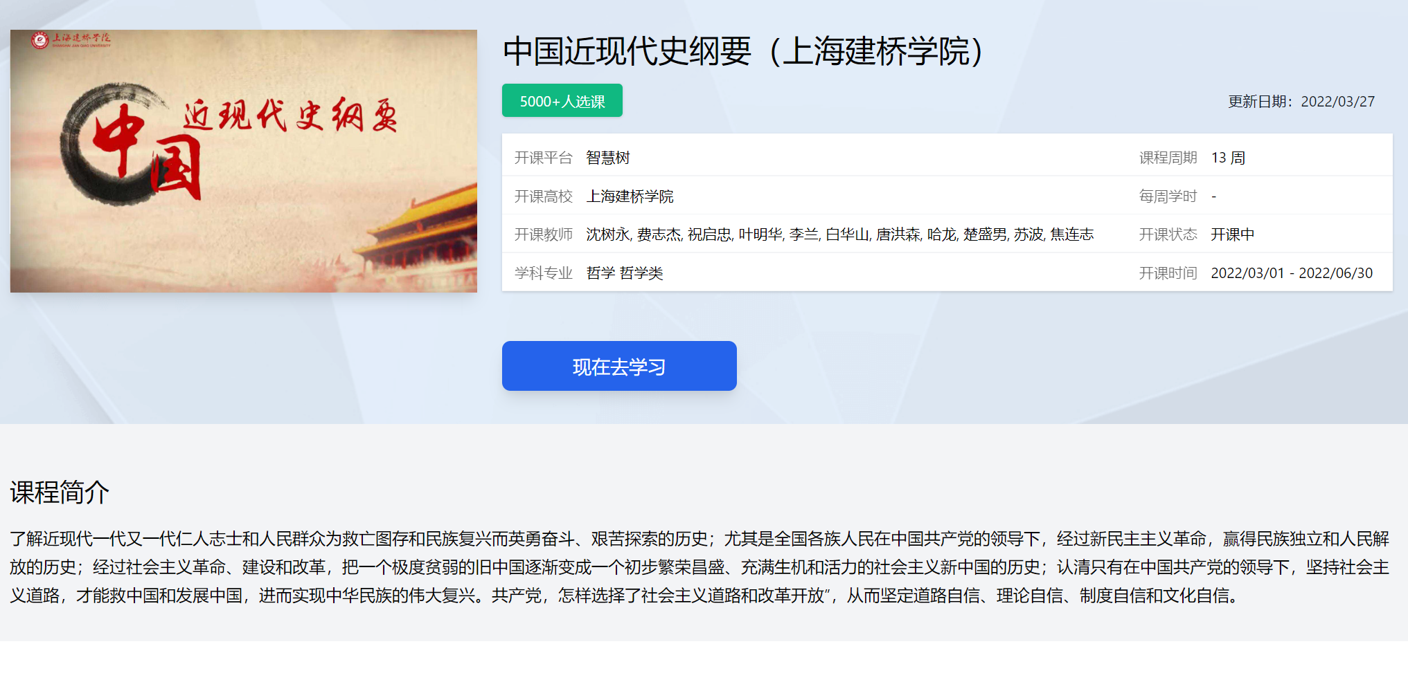 上海建桥学院共有5门在线课程入选“国家高等教育智慧教育平台”,分别是《马克思主义基本原理概论》《中国近现代史纲要》《建党百年英模谱》《奉献中国》和《网络安全技术》。五门课程选课人数已经突破4万人。