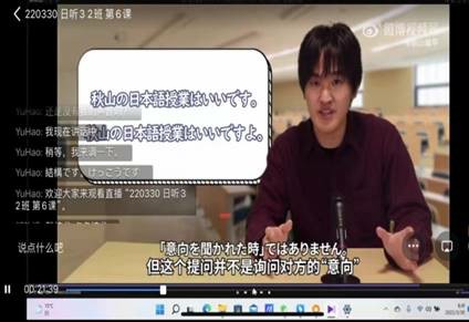 通过“课前建课、课上练听、课后体验”教学模式的展开,余颢老师深深体会到,学生上网课的精力和注意力是有限的,因此他特别注意对课堂节奏的把握,在讲授一个话题的时间往往控制在20分钟左右,然后把时间留给和同学们互动交流,或者通过放一个有趣的日语小视频,让同学们放松的同时,重新振作了精神,提高了学习的兴趣。余颢老师认为,线上教学的关键词——“参与度”,课堂是思想交流、迸发思维火花的一个很好的环境,老师和学生必须要有一定交流和互动,才能达到真正的教学效果。