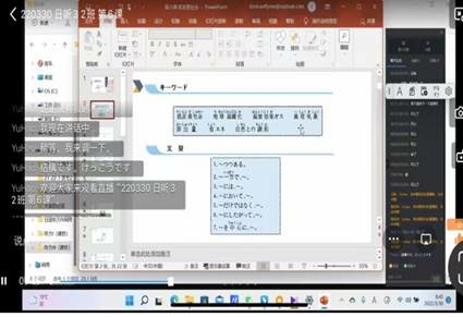 同时,作为商务日语专业《日语听力》系列课程的主讲教师,线下教学中原本可以360度全方位交流和互动的教学过程,现在因转为线上只能隔着屏幕传递声音和画面。在这种情况下,如何最大限度地发挥线上网课的效应,也成为余颢老师一直在思考钻研的问题。针对线上的教学效应,余颢老师开展了“课前建课、课上练听、课后体验”的教学模式,探索了一套“建、听、练”激发式的主观能动性教学,“课前建课”以超星平台建立日语听力分段式《每课一练》形式,促使学生在课前养成预习的习惯;“课上练听”以教材为基盘,钉钉课程平台直播讲解形式,并从课程思政的角度,通过抗疫新闻日语音频让同学们建立了“同心战疫、共待花期、守护生命、用心回馈”的意识。同时,根据教材的每课知识点制作PPT并运用板书互动的形式予以教学,在教授过程中,合理衔加了口译课程中“障碍性听力(辅助听力考核)”知识点,从而使同学们初步认识到口译与听力密不可分的关系,增加了日语听力技巧,培养了听力辨析能力、判断能力、随机应变能力等技能;“课后体验”通过B站、NHK新闻APP等资料的课间推荐,使得学生通过课后拓展资料的学习,拓展知识面,促进达到听力训练的最佳效果。