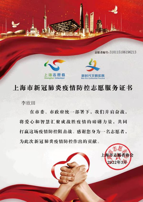 这场卷土重来的新冠,疫情防控工作严峻复杂,迫不得已学校全面开展网课,李欣田老师面对线上教学工作的挑战;与学生的及时沟通、网络培训的学习;学生论文的批阅和指导工作;加之孩子居家上网课,每天的三餐准备,这比平时上班时还要忙,但李欣田老师还是抽时间多次参加社区志愿者工作,她认为作为一名共产党员,这是义不容辞的责任与使命,在这样一个特殊时期,只有众志成城,同舟共济,才能共度时艰。她以实际行动为抗击疫情奉献绵薄之力,践行共产党员的铮铮誓言,无惧风险,不辞辛苦,共同抗疫,守“沪”这座城。