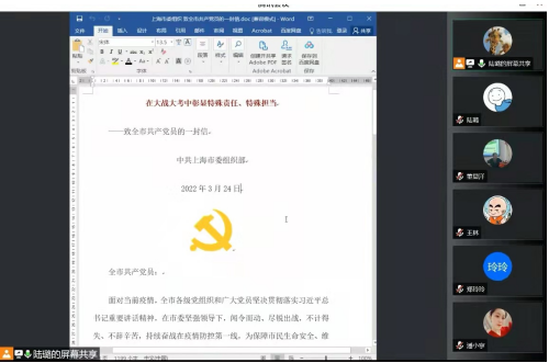 会上,支部书记陆璐带领全体党员学习领会习近平总书记关于疫情防控工作的重要讲话精神以及上海市委组织部《致全市共产党员的一封信》,特别强调所有党员在疫情防控行动中要发挥先锋模范作用,挺身而出,积极参与当地社区志愿者防疫工作,带头联系群众。