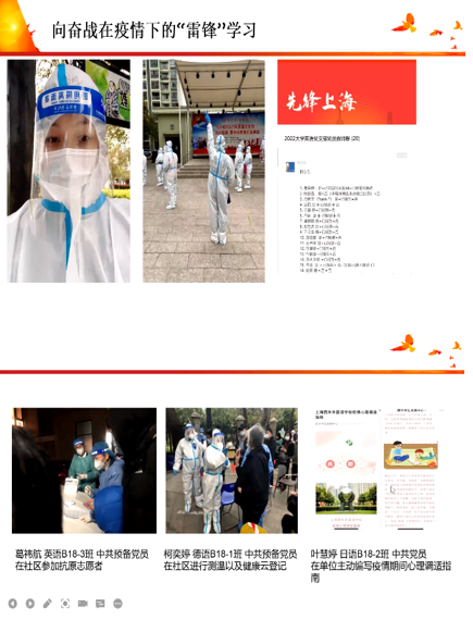 最后,关于如何学习雷锋精神,杜鹃提出:在工作、学习和生活中要做到“向上”,在理想信念、价值取向和人际关系方面要做到“向善”。她呼吁广大建桥学子,应聚焦雷锋精神的认知培育,在刻苦学习的同时提升自己的职业素养、专业能力,将雷锋精神融入自己的行动中。目前恰逢抗击疫情的关键时期,全国上下万众一心、齐心协力共度难关,在我们身边也涌现出一批甘于奉献的“雷锋力量”,比如:响应组织号召的大学英语支部教师党员傅荣琳,在确保教学质量的同时,在居住地社区完成“双报到”投身志愿者服务中;还有在社区参加抗原志愿者的葛祎航、参与社区测温及健康云登记工作的柯奕婷、在实习单位中主动编写疫情心理调适指南的叶慧婷……还有无数为抗击疫情坚守在校园的辅导员老师、后勤工作者、积极分子们,他们不计个人利益、有一份光发一份热的奉献精神正是值得我们学习的优良品质。