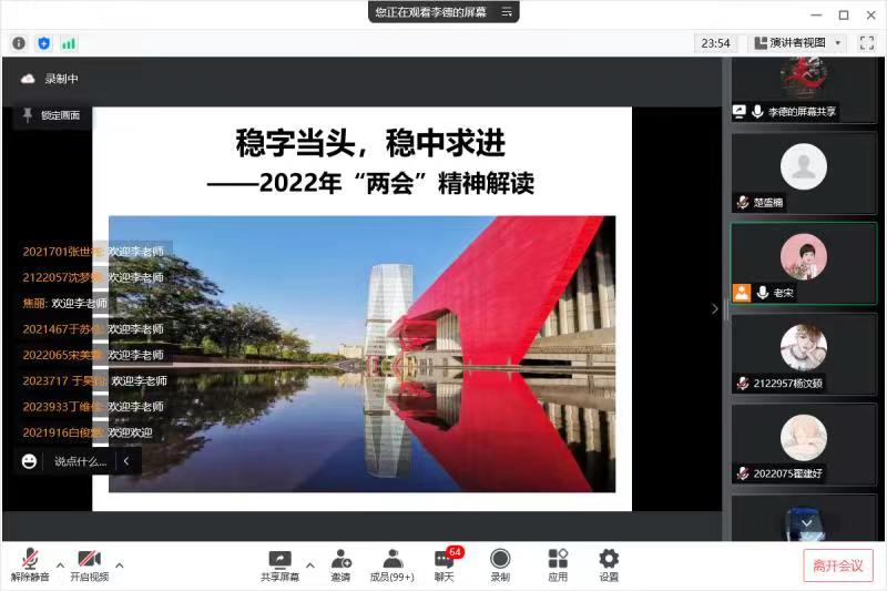 李德教授以“稳字当头,稳中求进”八个字对刚刚结束的两会进行了高度凝练。他从“两会”的实质、今年两会的热点问题、政府工作报告和政协工作报告的主要内容等方面对两会精神进行了深入而全面的解读。李德指出两会是我国全过程人民民主的集中体现,这种全过程人民民主是制度、程序与实践的统一,是实质的民主、真正的民主、管用的民主,而西方的民主只是形式上的民主。他概括了今年两会的六大热点问题:稳定经济大盘如何发力、重要领域稳中求进、民生保障、地方组织法的修改、外部环境应对。在对政府工作报告的解读中,特别强调了我们在未来面临的风险与挑战:四种考验、四种危险、四个重大、多种陷阱和三重冲击;对政协工作报告的讲解则突出体现各族各界的大团结大联合,提醒防止敌对势力以宗教进行的渗透。最后,李德着重指出两会精神体现了新时代中国共产党人的责任与担当!