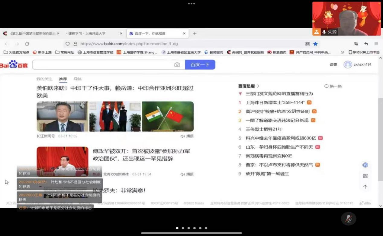 其次是学生主讲。朱漪教授将此环节分为学生点评时政新闻与学生主讲教材内容两部分。学生点评时政新闻部分由三人左右发言,并进行相应的加分;然后让每个学生在聊天区留言发言,并进行考勤;最后老师推荐一条重要新闻,并简要点评学生发言情况。学生主讲教材内容部分则是由朱漪教授提前布置主讲题目,学生以小组为单位提前备好课,他进行课件审阅;课中朱漪教授根据授课角度适时安排学生主讲教材某一内容。通过学生主讲环节,赋予了思政课堂生命力,提高了同学们的思辨能力,学生的主讲水平越来越高,而且某些方面比老师讲的还要出彩、有特色,整体效果很好。