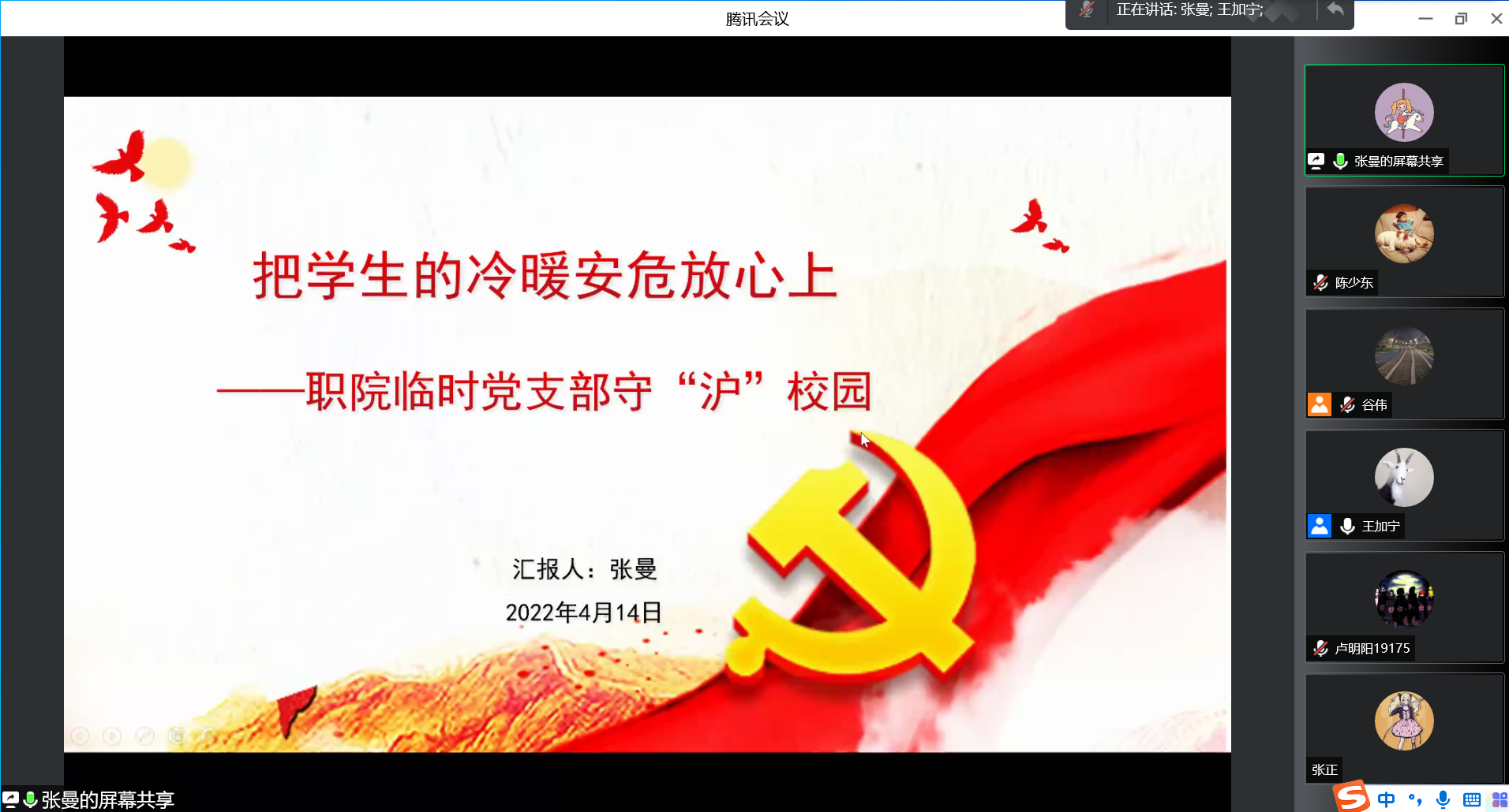职院临时党支部是一支特殊的队伍,是由在校内值守的7位党员临时组建的党支部,作为学院校内抗疫的一支“劲旅”,他们期间承担了繁冗且重要的防疫任务。他们坚守一线,守“沪”校园,把学生的冷暖安危放心上,履行党员义务,彰显了党员担当。张曼同志代表发言,介绍临时支部的工作情况。张曼同志表示,学生出现核酸检测异常,疫情就是命令,支部党员全体出动,完成了排查工作,及时做好学生的转运隔离及对接服务工作,连续多日值守,组织学生志愿者,完成了多楼栋学生餐食的分发。他们群体中,既有逆行进校的、也有坚守岗位一月有余的。支部在校园值守、应急处置、楼栋排查、核酸检测组织等方面,继续发挥重要的作用。