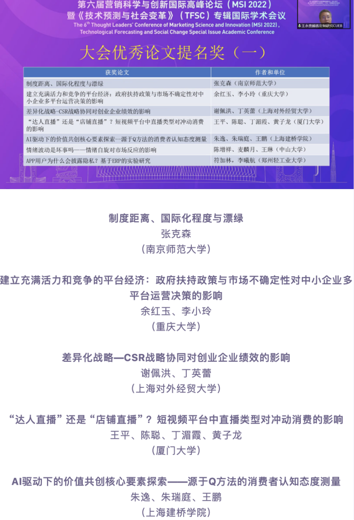 我校朱逸、朱瑞庭、王鹏提交的参会论文《AI驱动下的价值共创核心要素探索——源于Q方法的消费者认知态度测量》,经过400余篇论文的匿名评审和严格的层层筛选,获得大会优秀论文提名奖,相关研究内容在会议上进行了主题汇报。在所获奖的高校、科研机构中,本校为唯一获奖的民办高校。
