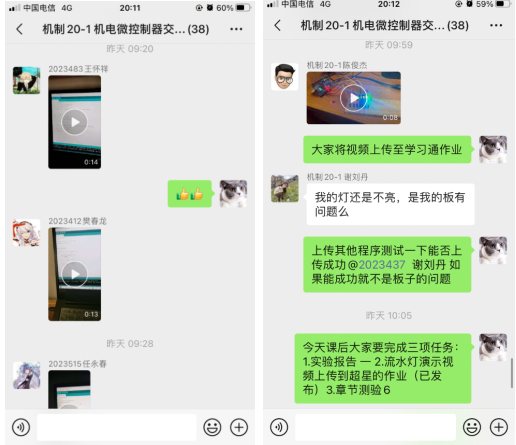 第四,鼓励学生分享学习成果,课后及时为学生答疑解惑。吴老师鼓励学生多在微信群分享学习成果,对于在规定时间内完成实验达到实验效果的学生给与加分;鉴于该门课中部分项目化实验在软件编程和硬件设计中容易出错,吴老师也鼓励学生多在班级微信群中多提问,并及时给与解答。