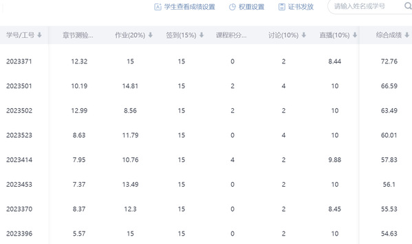 第五,线上学习积分的考核多元化,全面考查学生线上学习效果。该门课程将期末考核的1+X中的X1线上学习积分部分进一步细化,具体包括:章节任务(微视频观看、文档阅读)、章节测验、作业、签到、课堂互动积分、主题讨论、直播参与时长等,能够相对全面考核学生线上学习效果。课后吴老师通过后台查看、分析学习数据并对积分特别低的学生给与学业预警。