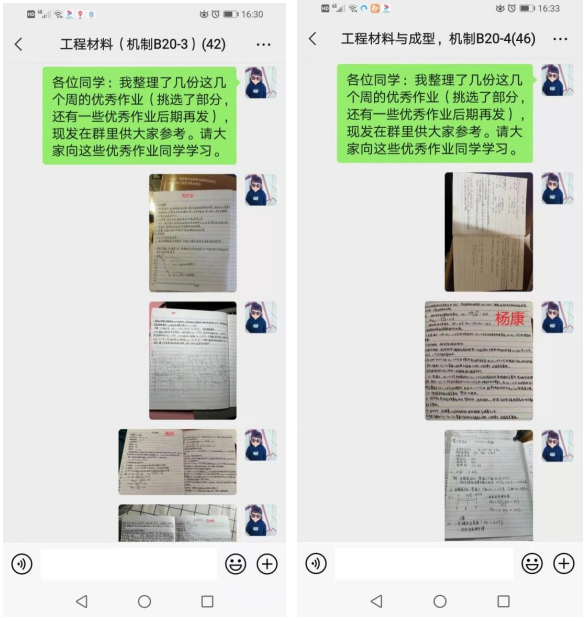 第一,每天上课,要求同学们开启摄像头,进行班级合影,合影发在班级微信群:方便点名;让上课更有仪式感,防止部分出现同学挂课。第二,课堂直播时进行录播,课后将课堂录像上传教学平台,方便学生看回放。第三,通过对分易平台发送信息到学生手机和微信发班级群两种方式,及时催交作业。每周进行知识点总结,布置本周作业及预习。第四,上课过程中,加强与学生的互动,抽查部分学生,让学生发送题目答案至微信群;课后,为了督促学生完成作业,在班级随机抽几位同学,要求在规定的时间将作业发至班级群或者私信老师。第五,定期在微信群进行优秀作业展览,鼓励优秀学生,同时可以起到激励其他同学的作用。