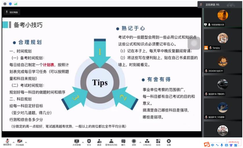 会上,两位成功考取“三支一扶”和事业单位的校友在线分享宝贵的备考经验。许丁同学首先向同学们介绍了什么是事业单位,其次从职业发展、岗位收入、工作稳定性等方面分析事业单位的优势,通过表格清晰地为大家展示了目前事业单位在招聘应届生、往届生时的比例和要求。钱佳娣同学则从什么是“三支一扶”出发,详细介绍了“三支一扶”报考条件、服务期间的待遇、服务期满后的优惠政策以及各项招募流程等,同时结合自身经验向同学们分享了她的备考方法和答题技巧。