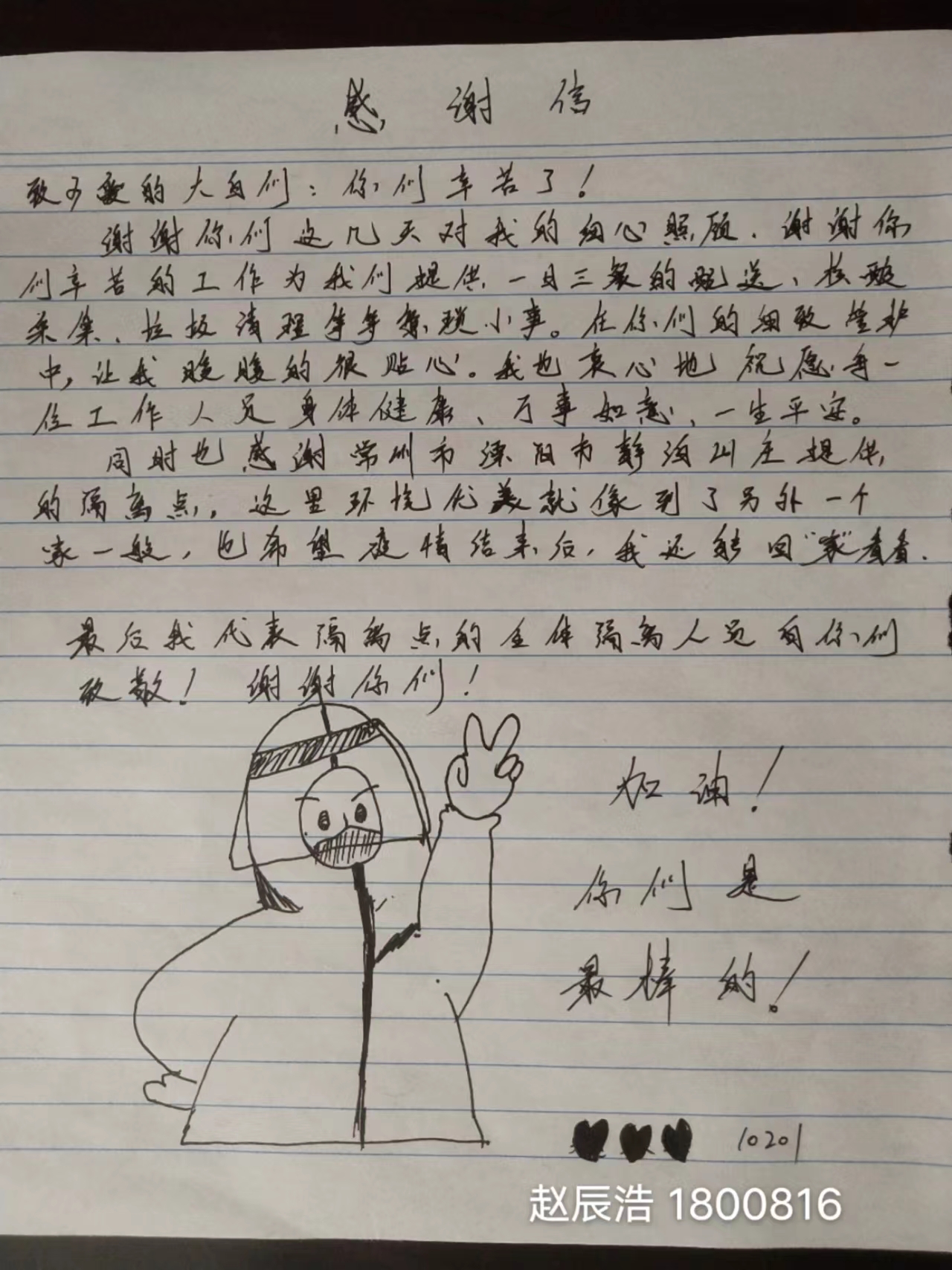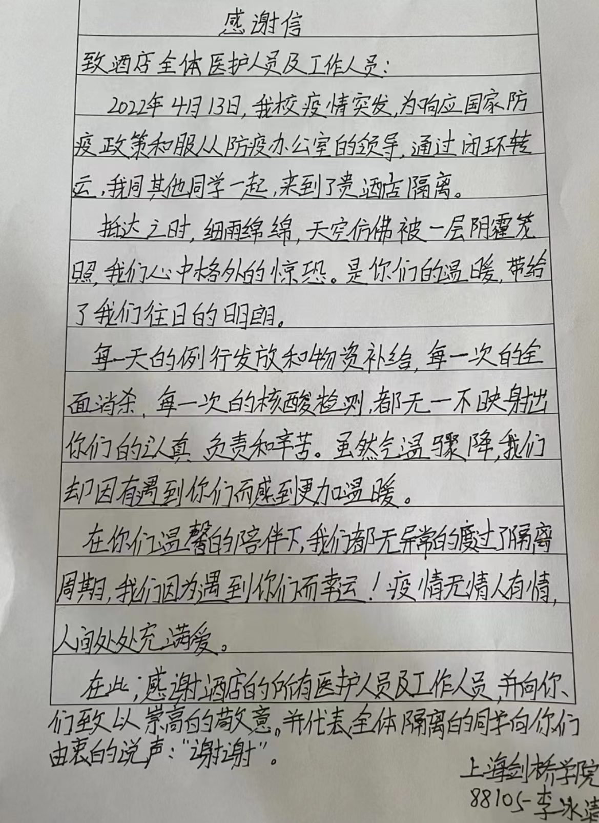 江苏人民的深情厚谊学校始终记挂在心,学校以“大疫见真情,关爱暖人心”开首的一封感谢信也传递到当地政府手中。在看到感谢信后,楼栋负责人何孝婷十分感动,“短短的相处时间却让我们建立了深厚的情谊,目送他们离开时内心也充满不舍,感谢这些小可爱给我们的隔离点带来了欢声笑语,祝他们前程似锦、未来可期。”
