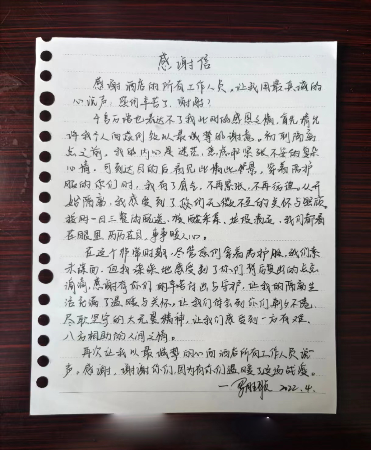 在离别之际,同学们纷纷写下“感谢信”,感谢“无名英雄”们无微不至的照顾。柯翔桢同学在信中写道,“哪有什么岁月静好,正是你们的负重前行,才让‘失去自由’的我们如此舒适,尽管我看不到你们脸上的汗水,但能听到你们轻柔细小的声音,就能感受到你们的疲惫与坚持,等疫情结束,我还会再来这里。”谢飞扬同学感怀道,“把苦累脏留给自己,将乐安康送给我们,谢谢你们用生命守护生命,经历了才知你们的可贵,安全了才知你们的伟大。”