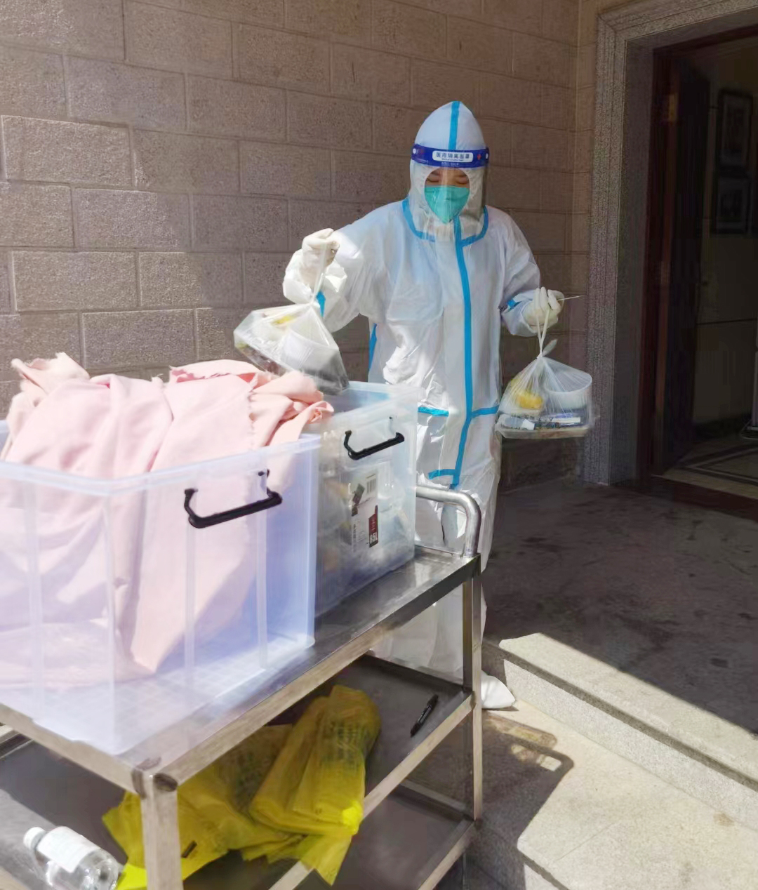 每天一次核酸,两次测体温,三餐送上门,常州“大白”们奔波于各个楼栋楼层每一间,从早到晚数不清的上下敲门、送餐、消毒、收垃圾。由于“大白”们穿着防护服,学生们每天享受着热情周到的服务,却不能看清他们的模样。