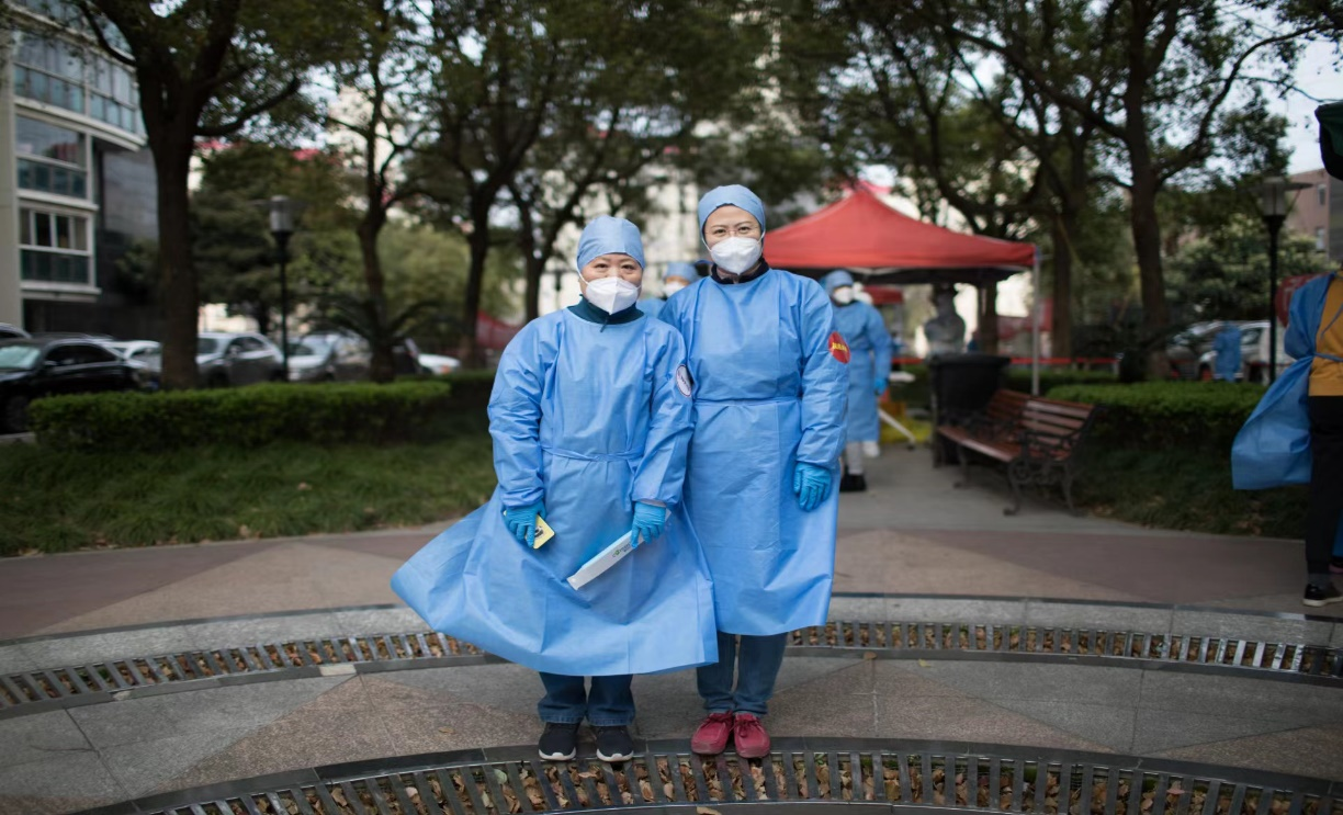 图4 母女齐上阵,组织居民参加核酸检测 (左:童年母亲;右:童年老师)