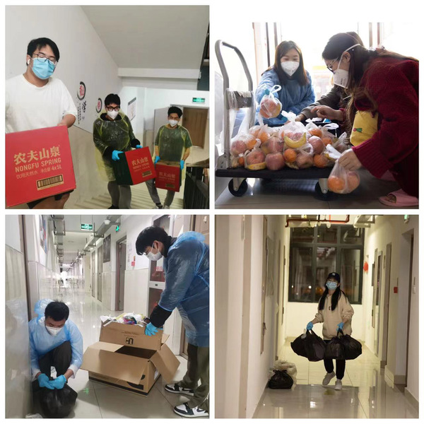 因学校处于应急响应阶段,要求同学们足不出户,寝室的垃圾无法自行扔到垃圾站,党员服务队主动承担起清理和运送每一间寝室门口的垃圾到垃圾站,每日早晚分两次对公共区域卫生进行集中清理打扫、消毒,确保公寓整体环境的干净与舒心。除此之外,党员服务队还主动承担起“搬运工”,将同学们的寝室用水、生活物资按需搬运到寝室门口。