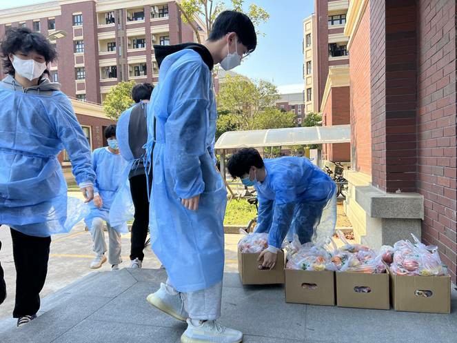 志愿者们忙完脱下防护服,身上衣服已经湿透,连口罩都积蓄了汗水。同学们收到餐食等物质,在安心被封控的同时纷纷感谢辛苦的志愿者们,每一声“谢谢”都是对志愿者们最大的鼓励。