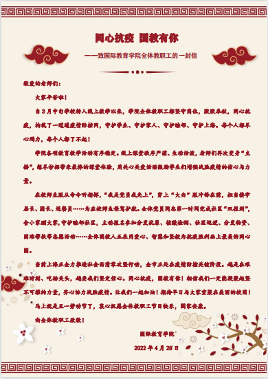 自3月中旬学校转入线上教学以来,学院全体教职工坚守岗位,默默奉献,同心抗疫,构筑了一道道疫情防控网。每个人都尽心竭力,每个人都了不起! 刘潇滢副院长代表全体领导班子诵读了“致国教全体教职工的慰问信”。