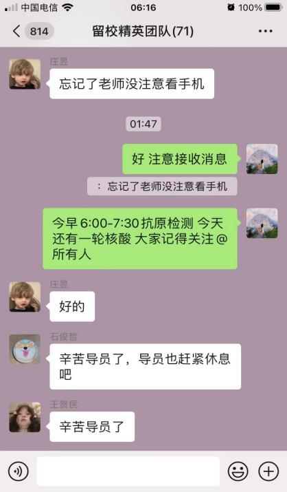 及时更新学生数据、领取分发抗原试剂、组织学生核酸检测、发放防疫物资、三餐配发、统一物资采购……反复的工作总是要到深夜才能结束,但每晚收尾工作前全员阴性的核酸截图是她疲惫工作一天后最好的定心丸。