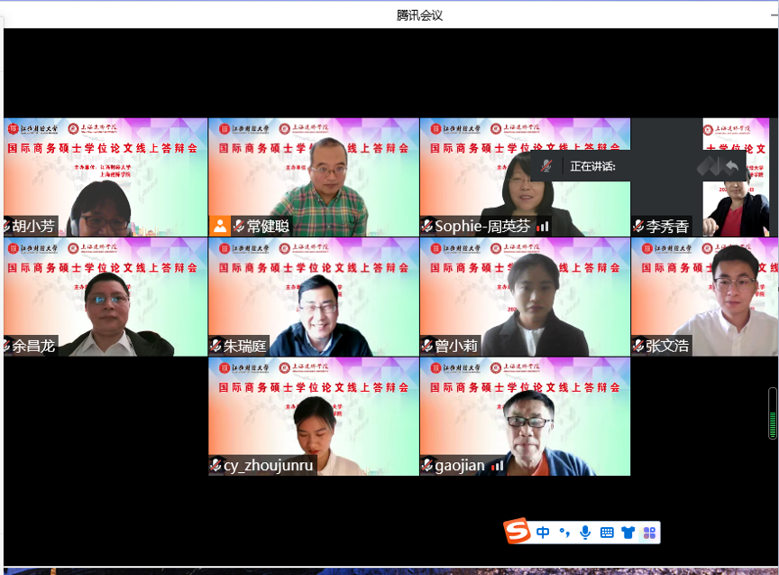5月14日,我校商学院与江西财经大学国际经贸学院共同举办联培研究生毕业论文线上答辩会。参加答辩的评委专家包括江西财经大学国际经贸学院的余昌龙副院长、李秀香教授、胡小芳秘书,我校朱瑞庭校长、商学院高健院长、国际教育学院周英芬书记、商学院院长助理常健聪教授。曾小莉等三位国际商务专业硕士研究生参加了毕业论文答辩会,全部通过答辩,顺利毕业。王嘉怡等三位海洋大学的在读联培研究生旁听了答辩会。