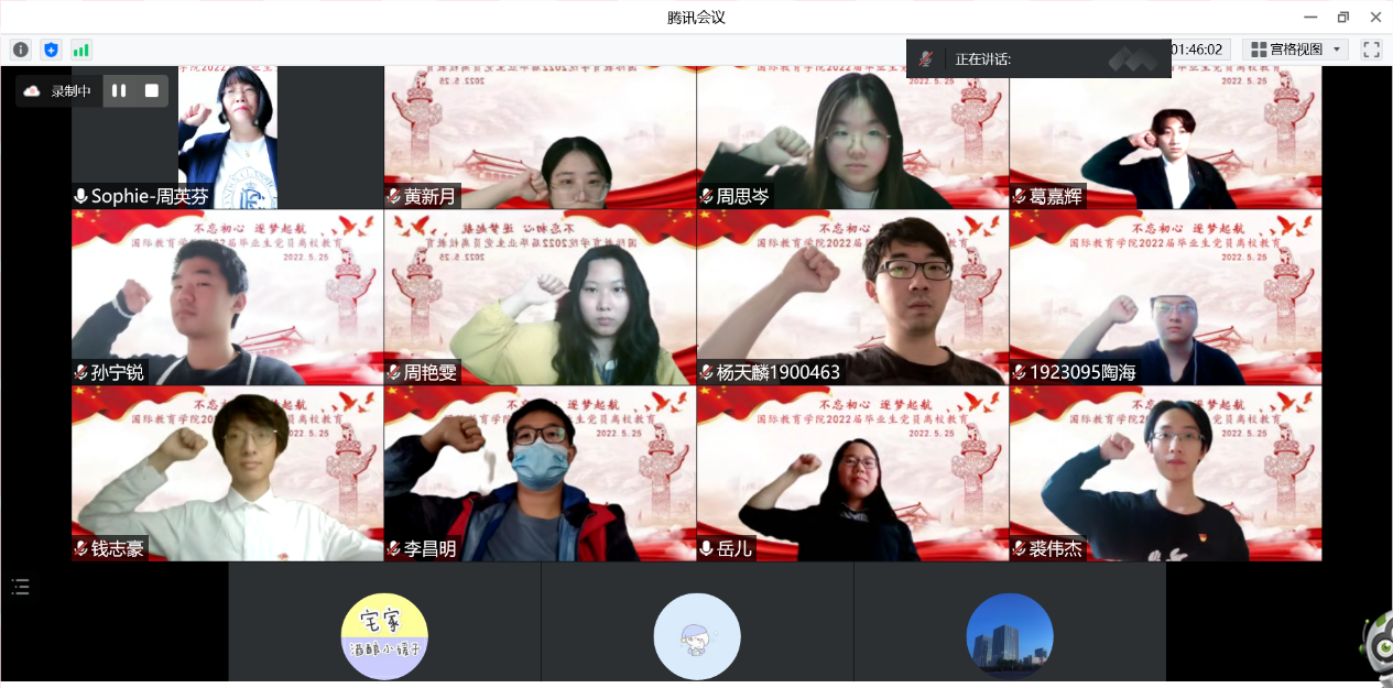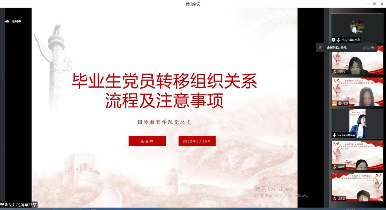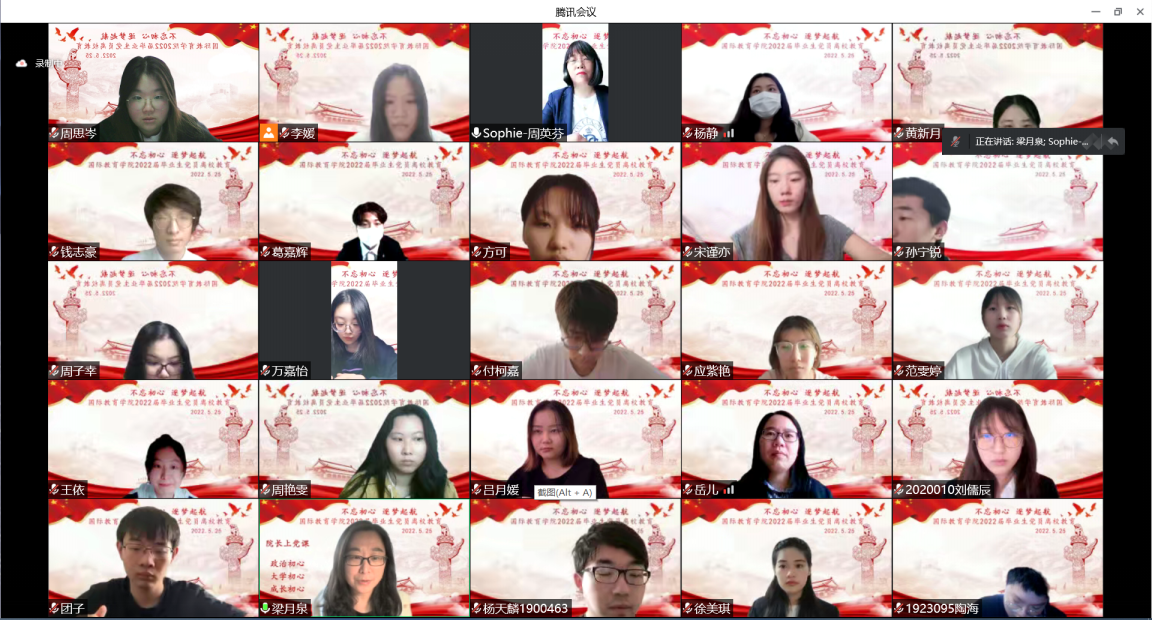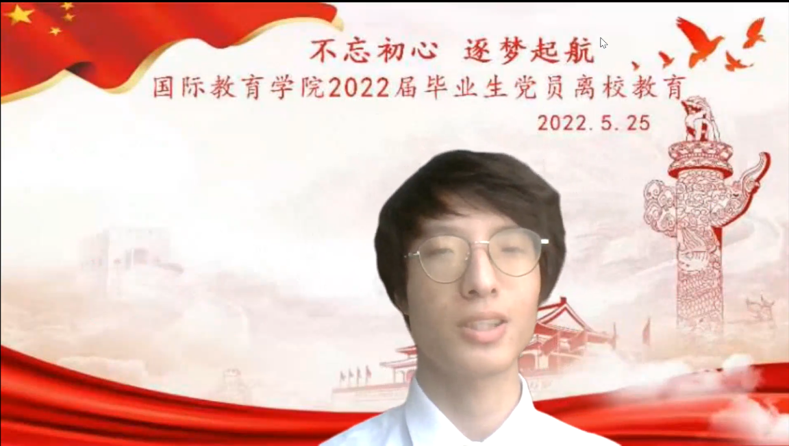 为使毕业生党员不断增强“四个意识”、坚定“四个自信”、做到“两个维护”,5月25日下午,国际教育学院通过腾讯会议组织开展2022届毕业生党员离校教育活动,国际教育学院院长梁月泉、党总支书记周英芬、党总支副书记高祺、党总支组织员岳会锦出席会议,学生党总支部25位成员和10名入党积极分子代表参加了此次学习活动。