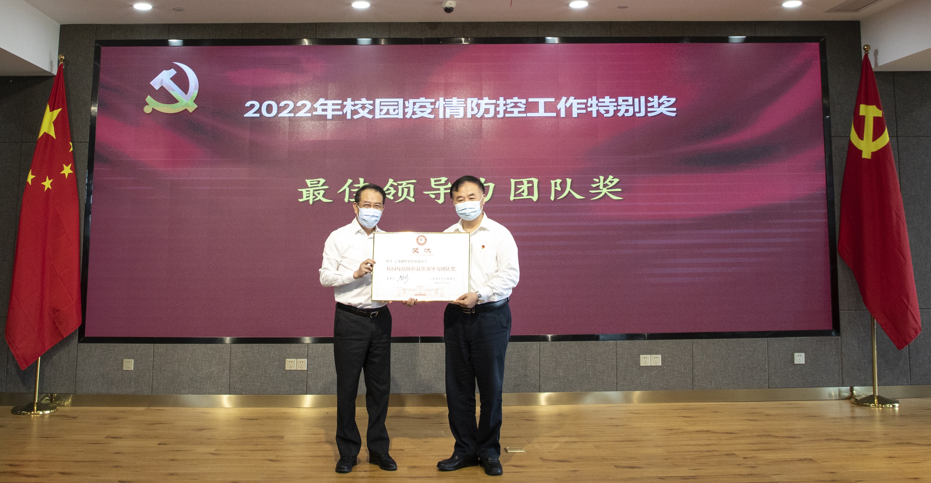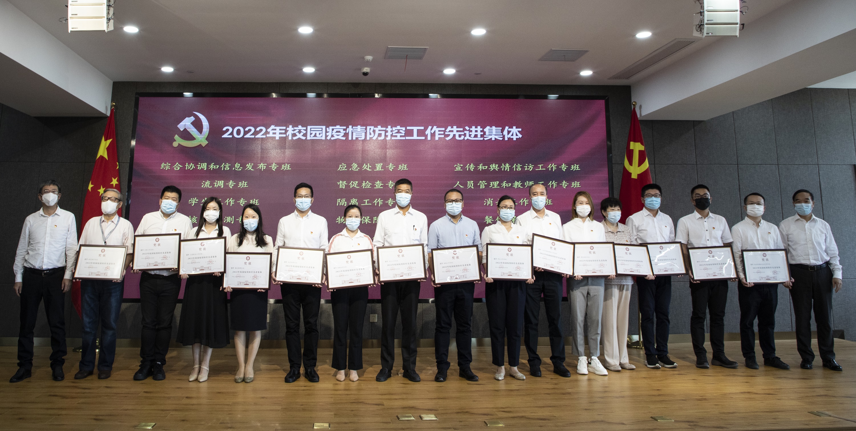 郑祥展副校长和俞晓光副校长为校园抗疫先进个人及先进集体颁奖。3月13日疫情突发以来,为了维护校园安全和12000名师生身体健康,学校动员一切可以动员的力量和资源,1000多名教工和后勤人员投入校园疫情防控的艰苦战斗中。他们不计得失、不分昼夜、不惧危险、不辞辛苦,舍小家、为大家,全力守护在校师生。为弘扬先进、总结经验、激励奋进,经校党委和办公会议研究,决定授予马婷婷等34人校园疫情防控工作先进个人一等奖,丁燕等53人为校园疫情防控工作先进个人二等奖,凡忠群等37人为校园疫情防控工作先进个人三等奖,丁智华等47人为校园疫情防控工作先进个人优秀奖。授予李桢等48人为建桥集团校园疫情防控工作先进个人。授予应急处置专班等15个工作专班校园疫情防控工作先进集体。